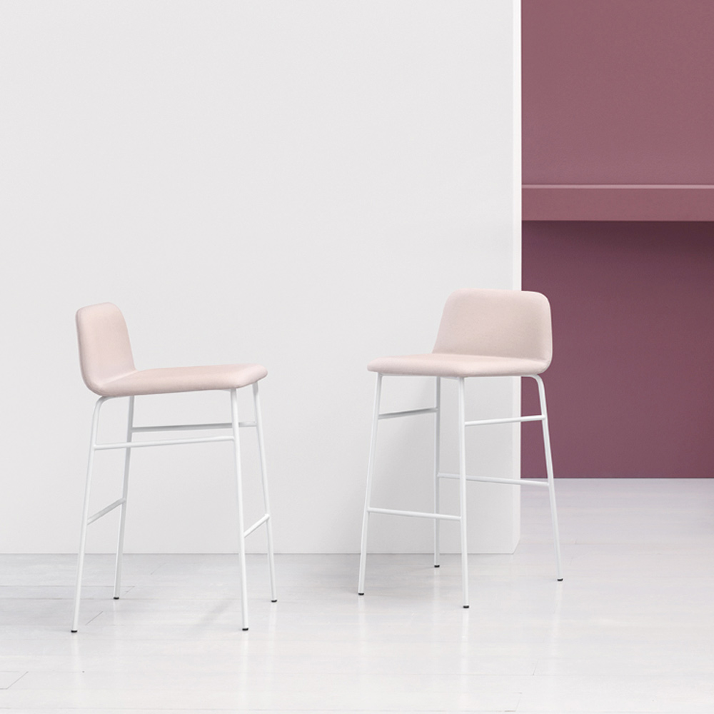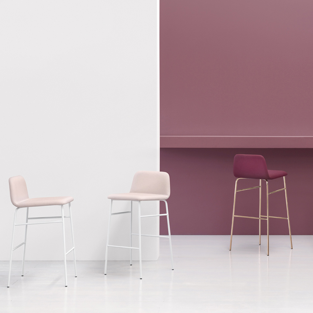 High stool made in Italy with painted metal structure and upholstered shell covered in fabric . Simple lines run through the figure of this complement with a contemporary soul designed and created for those looking for a minimal solution without having to give up an original and modern design. What is born is a seat that, thanks to the use of quality raw materials , reconciles functionality and style, managing to complete the furnishing of the room with a unique personality and a concrete elegance.