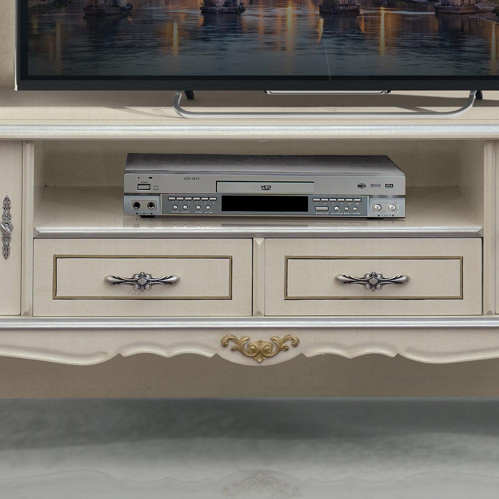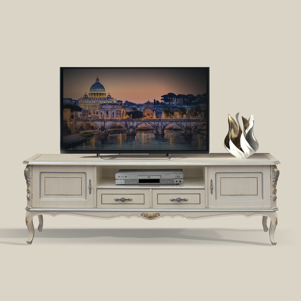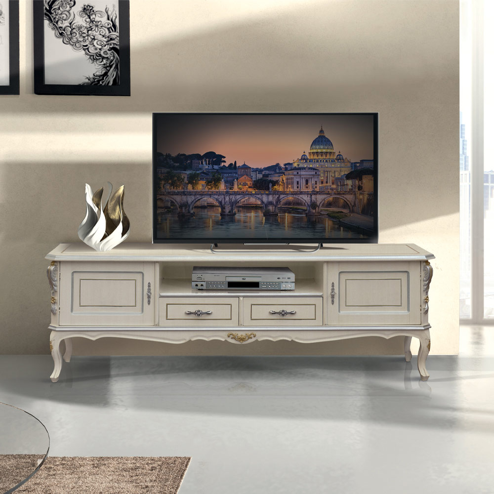 white wood with silver accents , available with 2 doors and 2 drawers or 2 doors, 1 drawer, and 1 compartment, it's perfect for any lounge. The