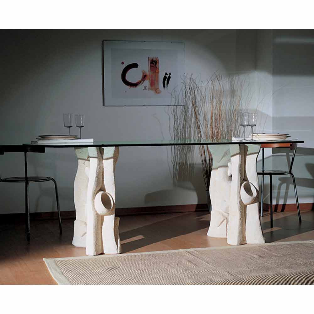 The dining table Daiana is entirely made in Italy. Its base is made of Vicenza natural stone and it has been hand-carved from the original stone block. The table top is made of float crystal (15 mm thickness) layd on the base.
