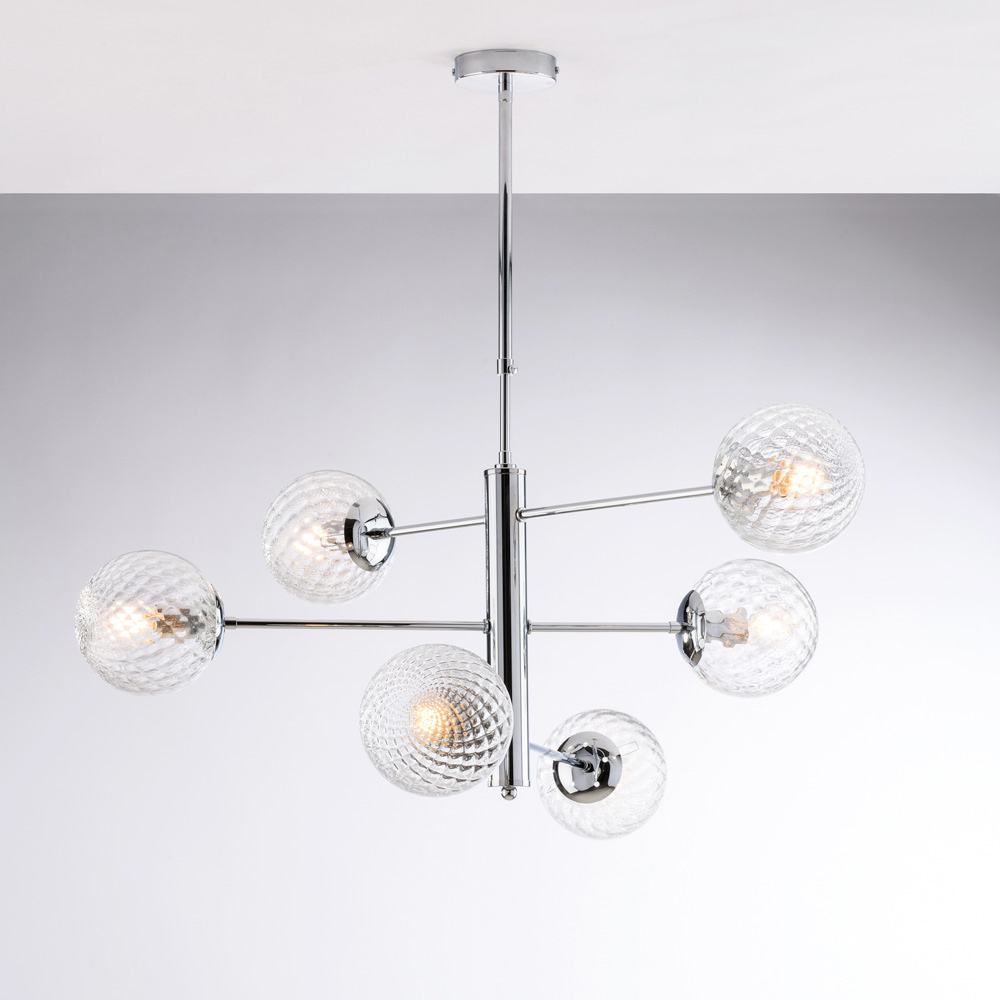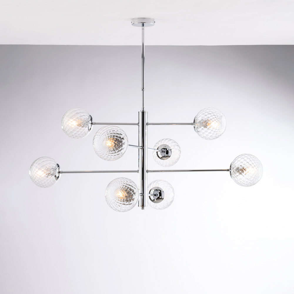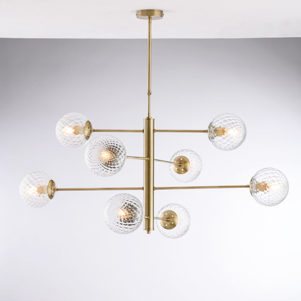 Elegant and contemporary, this handcrafted iron pendant lamp stands out for its balanced, geometric composition. The horizontal arms support spherical glass diffusers, creating a refined interplay of symmetries that casts a diffused, harmonious light.
