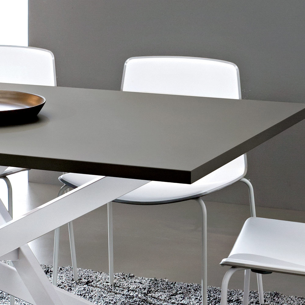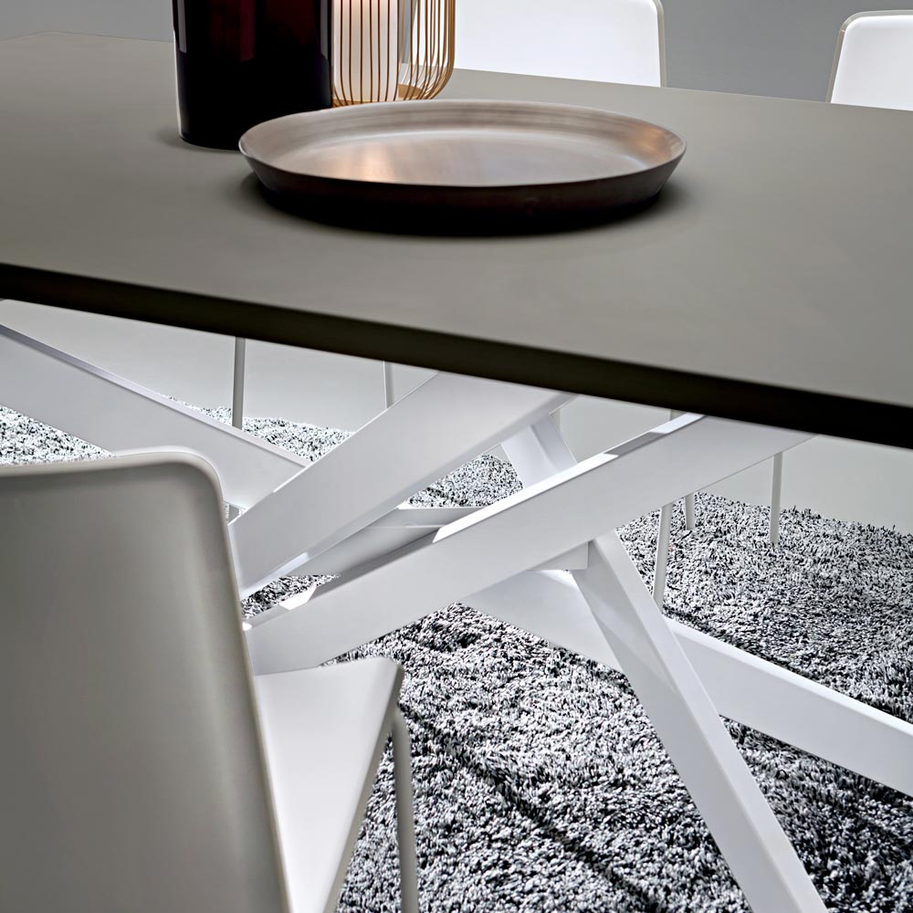 a simple and versatile soul whose design is enriched and made unique by the particular shape of the legs which, thanks to the unusual woven shape, give the table its true