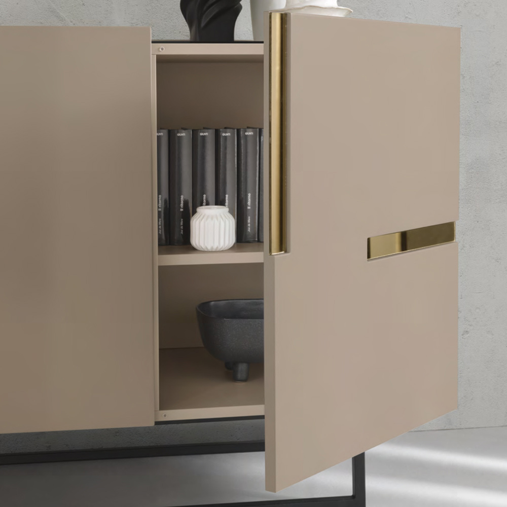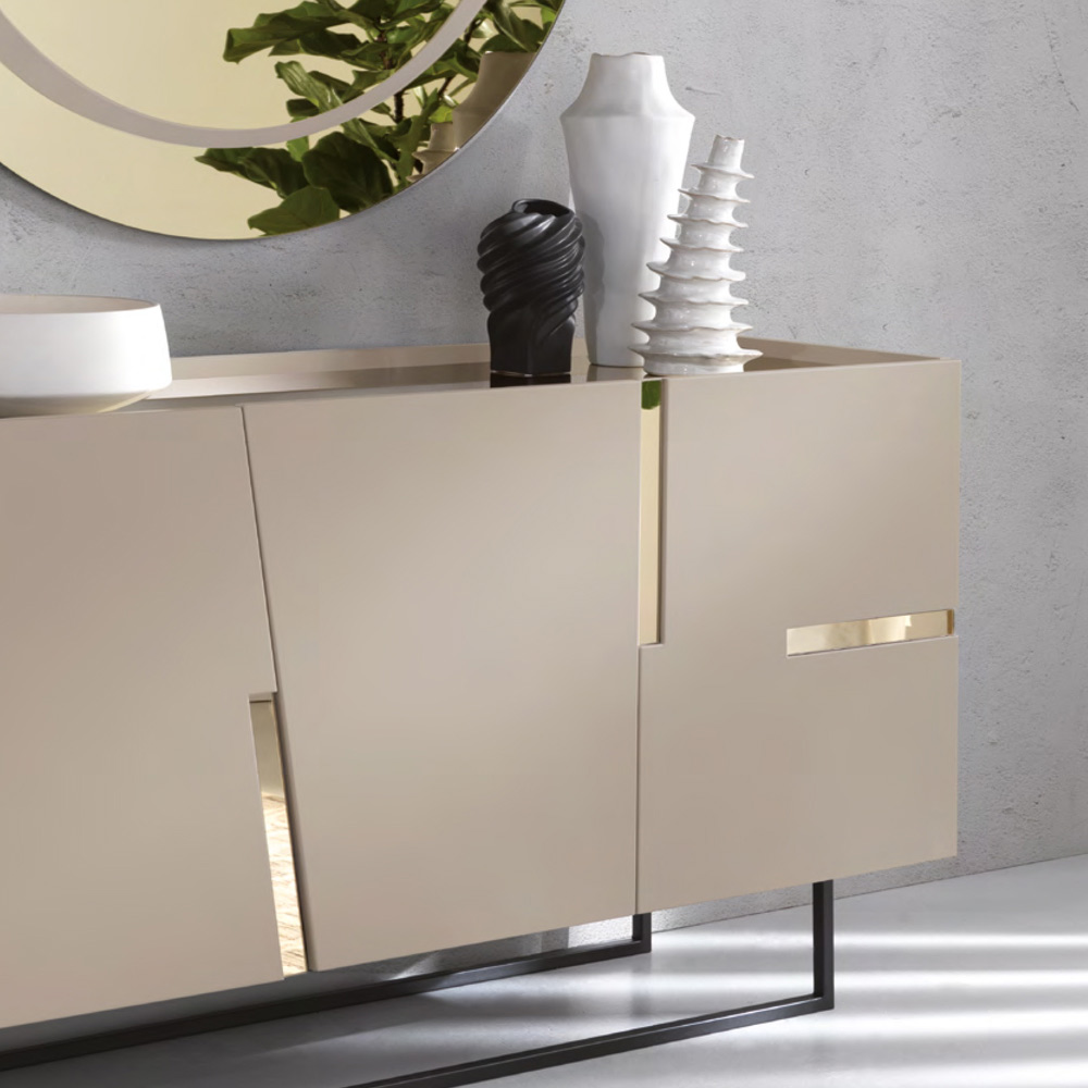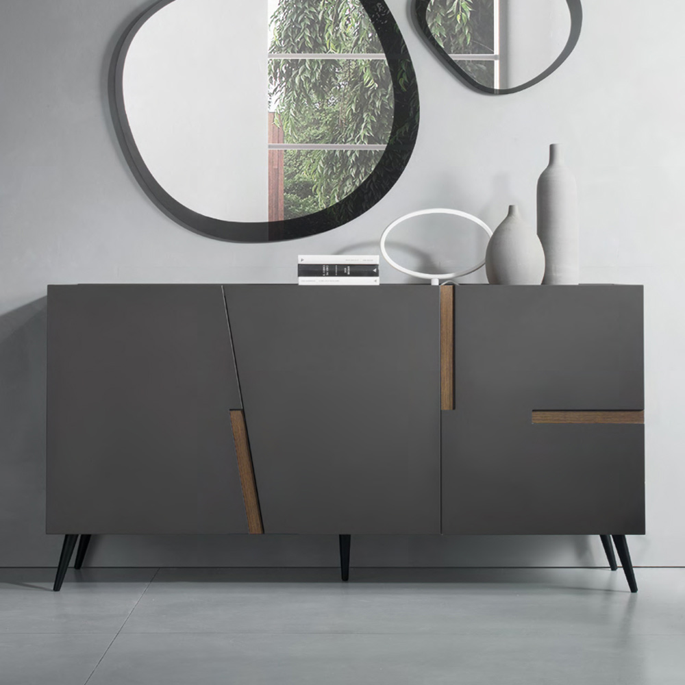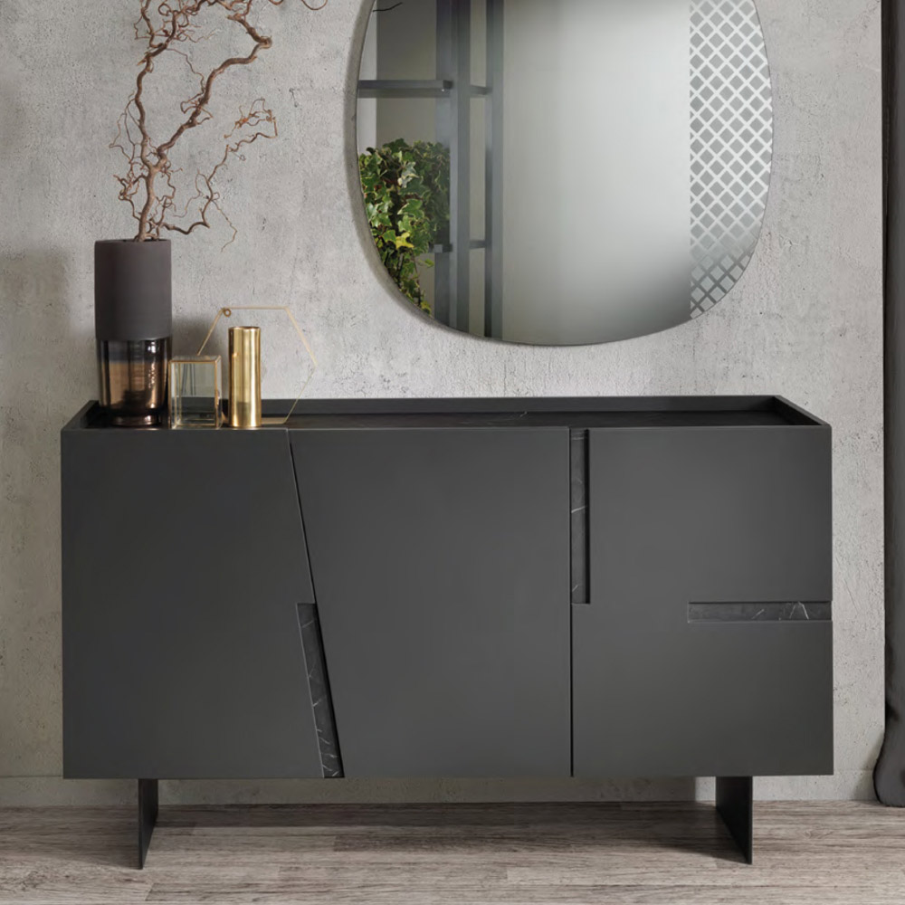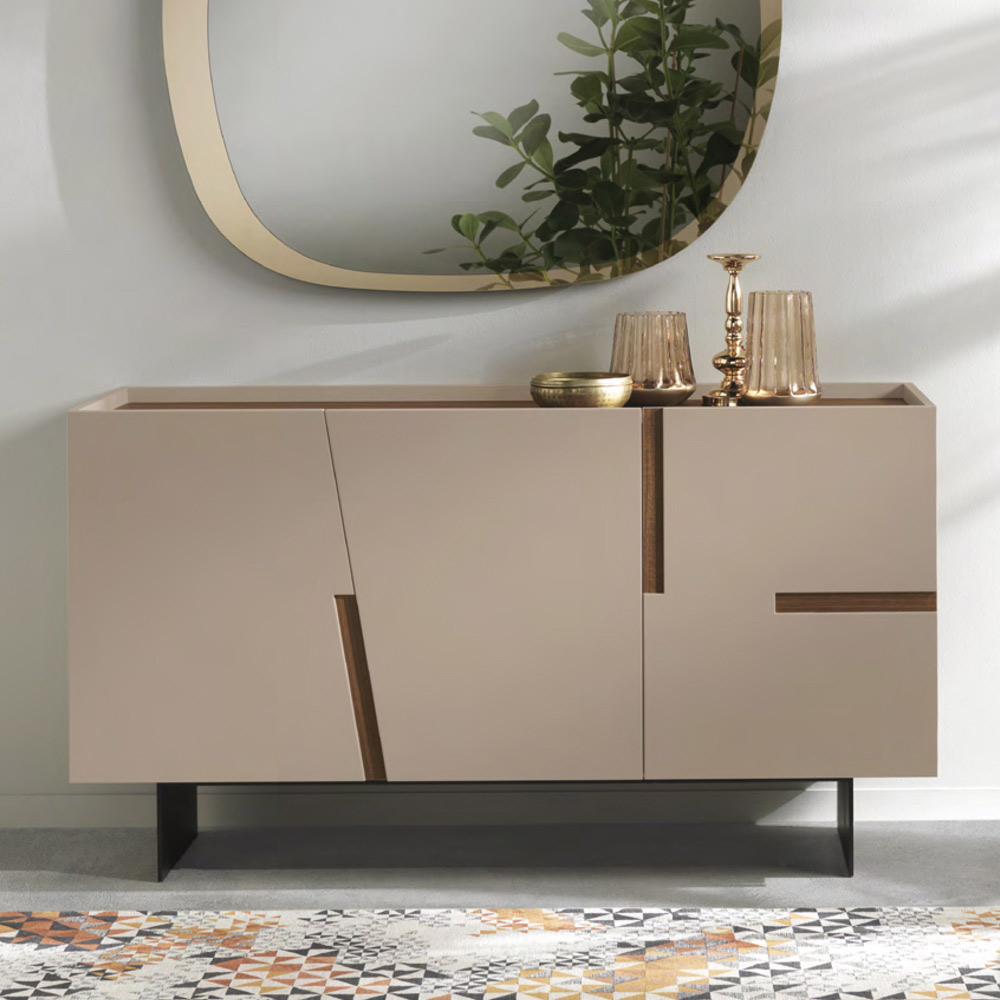 Living room sideboard in melamine with inserts in laminate or mirror Made in Italy.