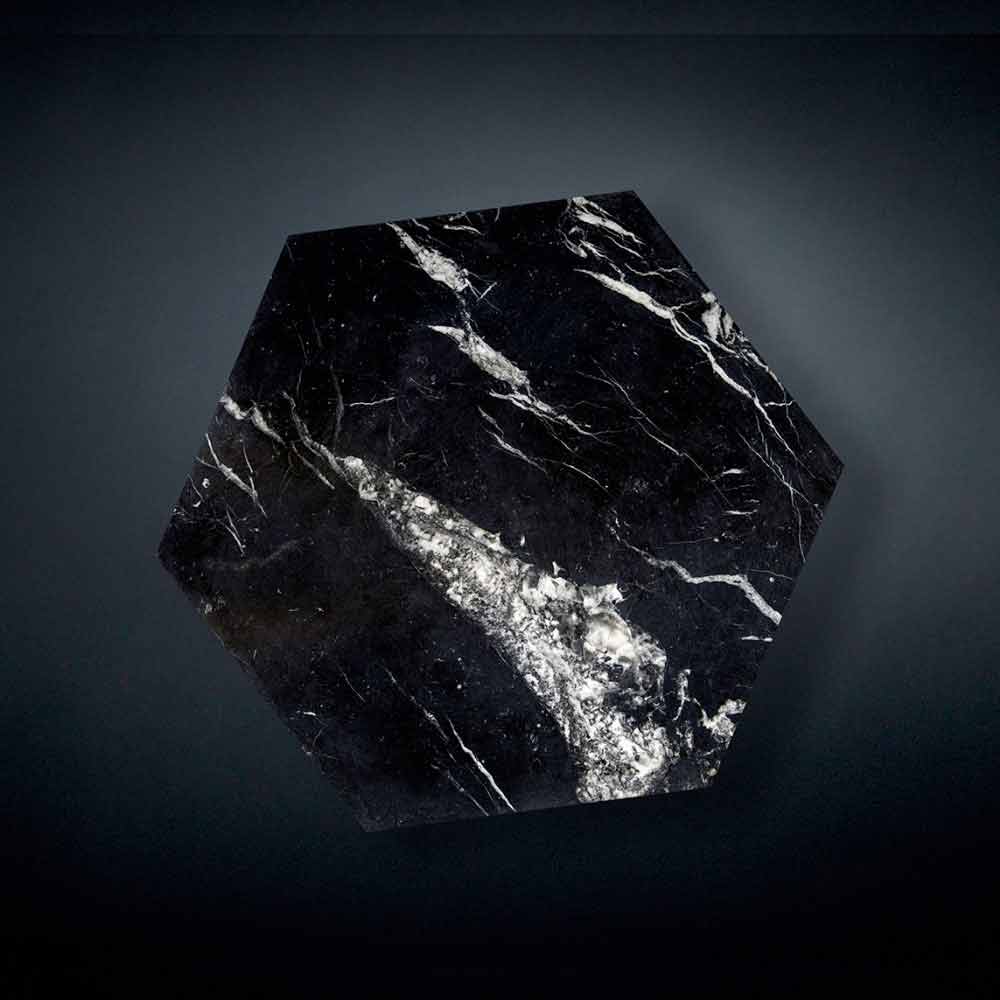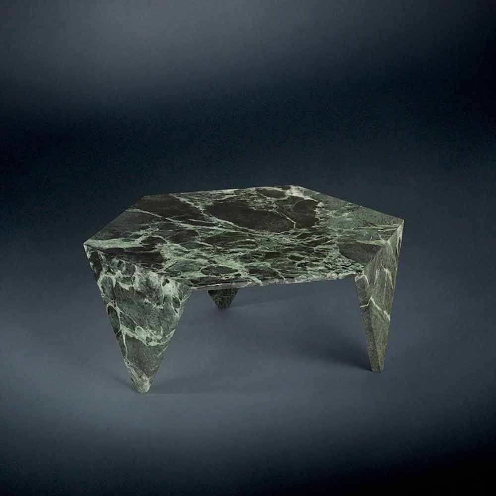 Ruche is a sturdy coffee table, characterised by an original and modern design. This special coffee table is made from marble and is available in four different finishings: Verde Alpi, Emperor Dark, Bianco Calacatta and Nero Marquinia. Hexagonal coffee table with three legs.