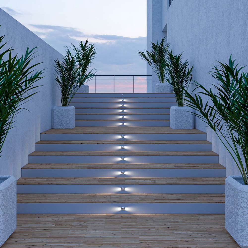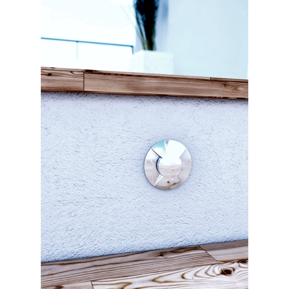 Outdoor spotlight projector with round recessed structure complete with 2W LEDs made of stainless steel . A functional element of technical lighting that offers optimal resistance and a minimal design ideal for signalling and lighting outdoor spaces such as corridors, entrances, paths, stairs or terraces. The result is a high quality and particularly functional complement that offers a welcoming atmosphere and highlights outdoor areas within domestic or contract environments.