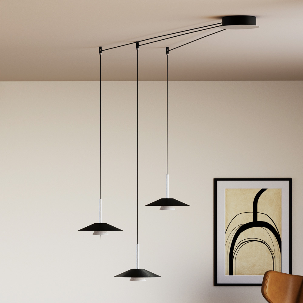 This lamp is a perfect fusion of contemporary design and industrial elegance , designed for those who love refined details and a bold aesthetic. The geometric structure, with a conical diffuser and large reflective disc, creates a fascinating play of volumes and contrasts , ensuring a directional and enveloping light.