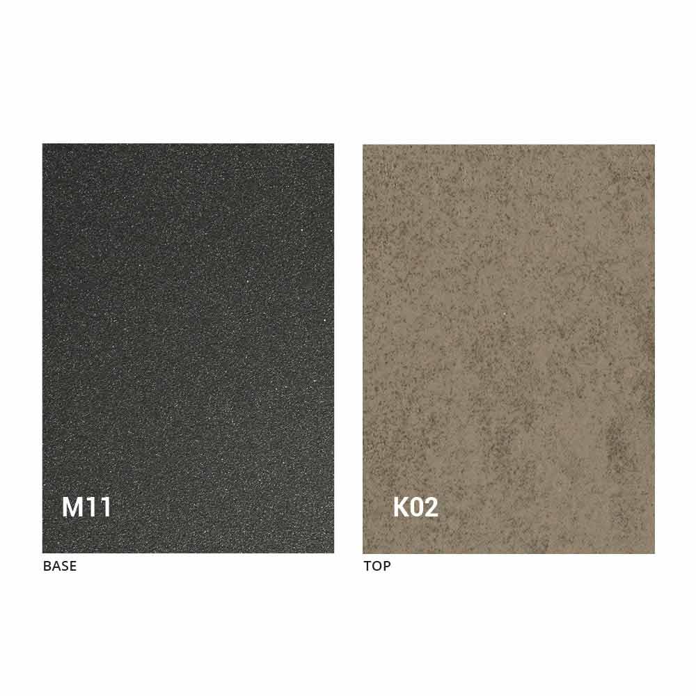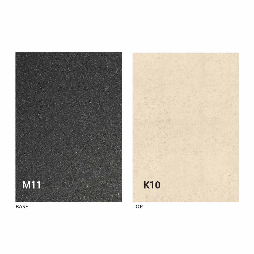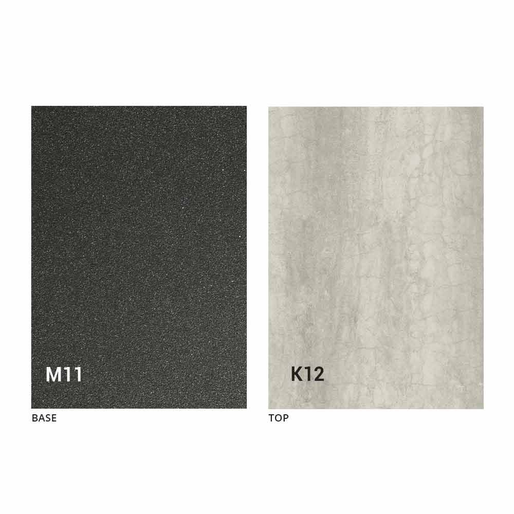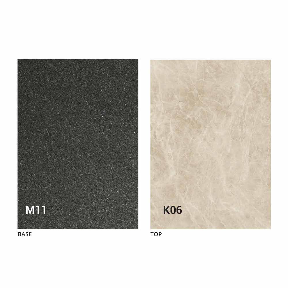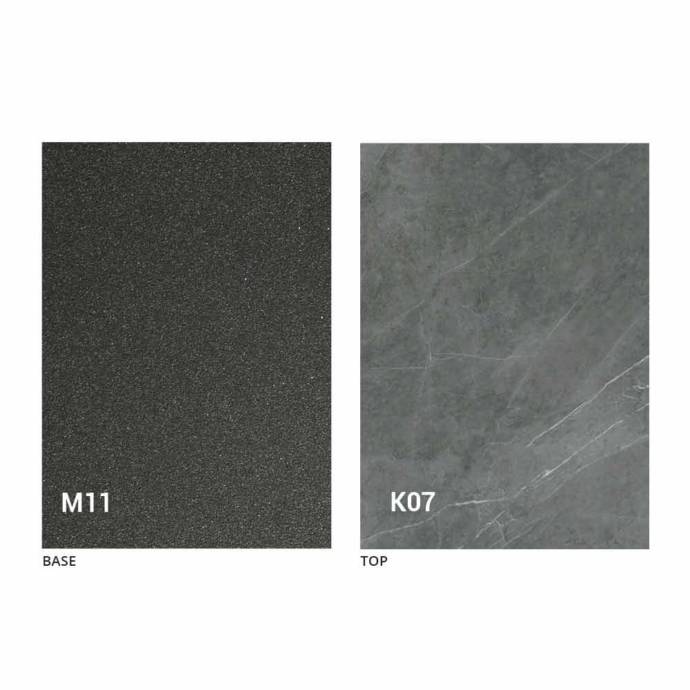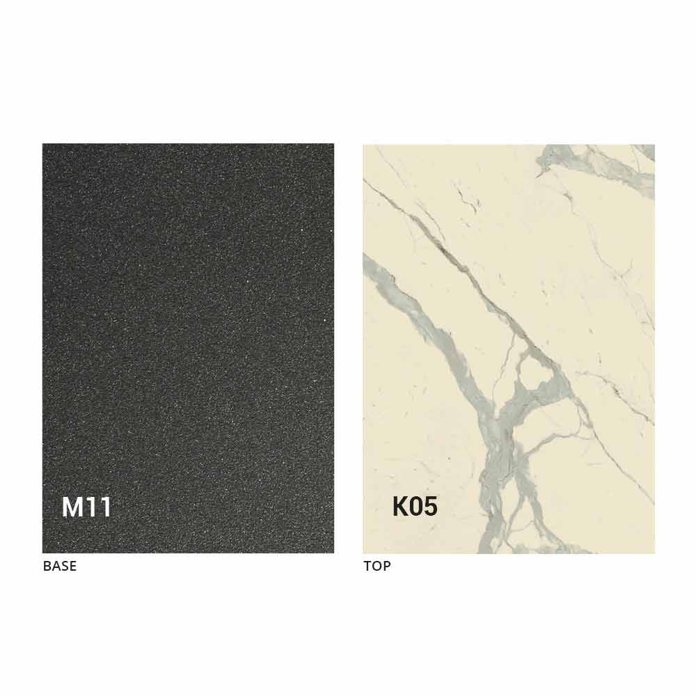 an MDF panel top with laminam ceramic on the surface, available in various finishes, and an embossed graphite painted