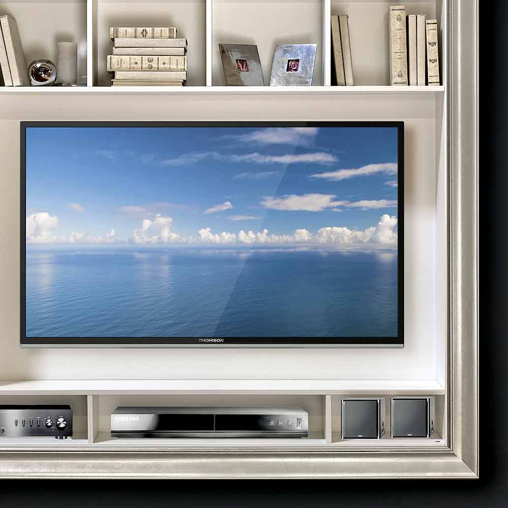 Inside the frame there is a television compartment which is set in the centre and is flanked by elegant shelves that offer space for books and decorative objects to personalize and enrich the space. Below, discreet compartments stylishly house multimedia devices, keeping the environment tidy and without exposed wires.