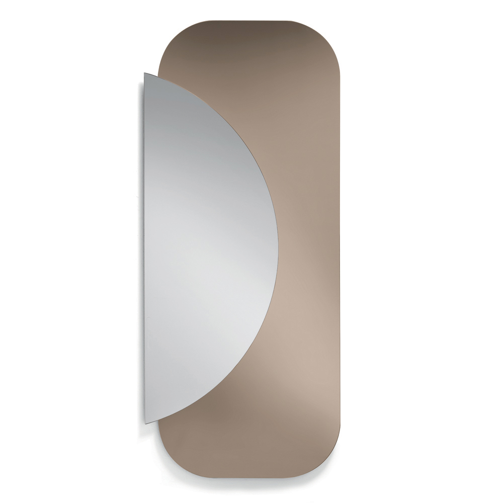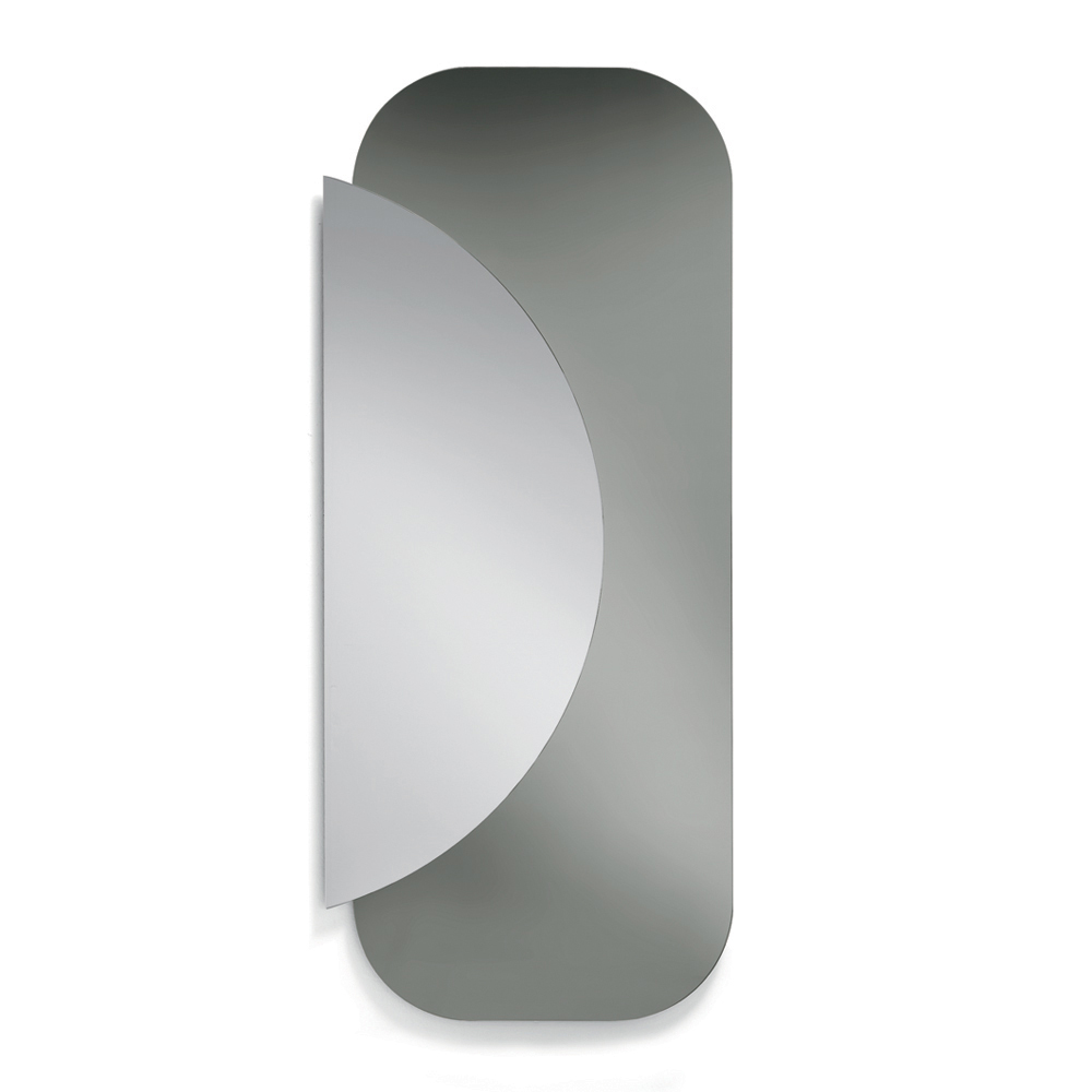 The composition is made up of two overlapping shaped plates : a rectangular base with soft corners and a semicircle of natural mirror that overlaps, creating an elegant dialogue between geometry and reflections. This contrast between shapes and materials creates a dynamic and contemporary visual effect.