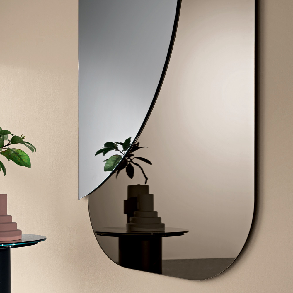 An elegant , Italian-designed shaped mirror , ideal for stylishly enhancing spaces such as the entrance , living room , or bedroom . Its modern design is distinguished by a refined interplay of overlapping shapes that gives depth and character to the wall.