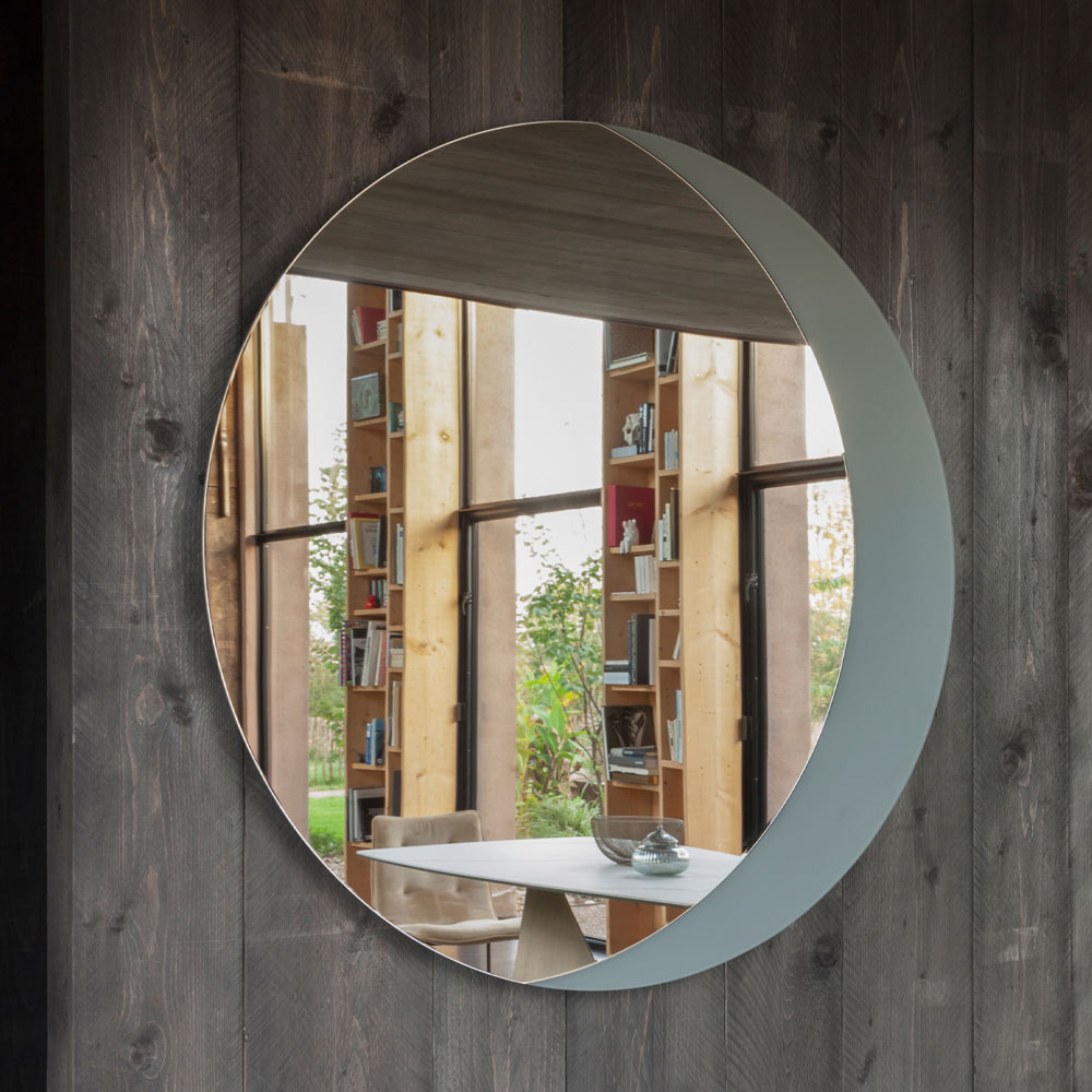 Round mirror with solid colour lacquered glass bottom Made in Italy