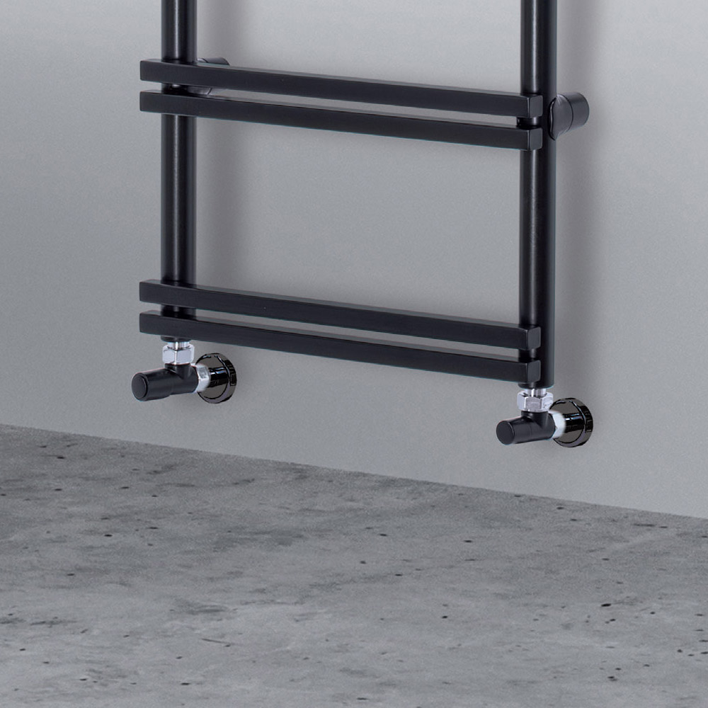 Mixed heated towel rail in carbon steel with jet black finish consisting of a series of horizontal elements with a 2 cm square section welded onto vertical manifolds with a diameter of 3.5 cm. Entirely made in Italy with wall fixing kit, vent valve and blind plug included .