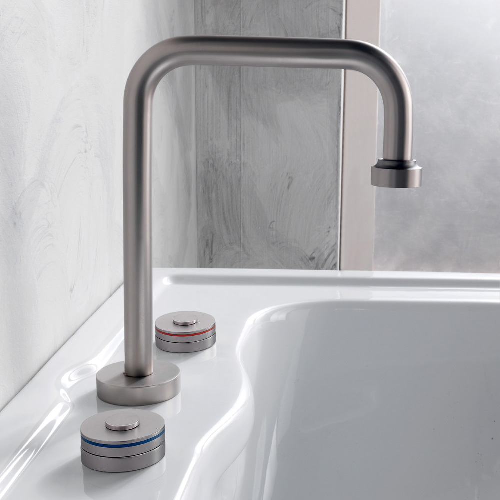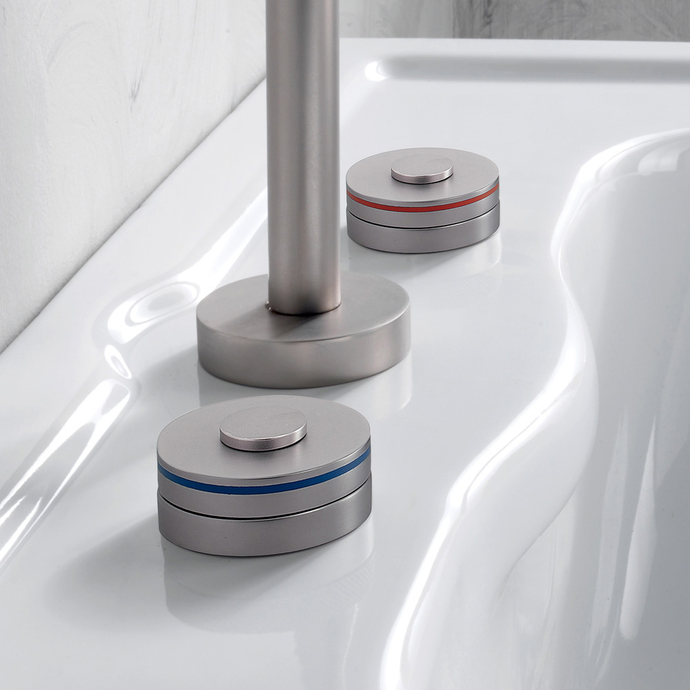 Battery 3-hole washbasin with drain entirely handcrafted by expert artisans in the field in heavy brass, cast in moulds that respect the craft systems of the past and protected with a thick layer of finish matte nickel.