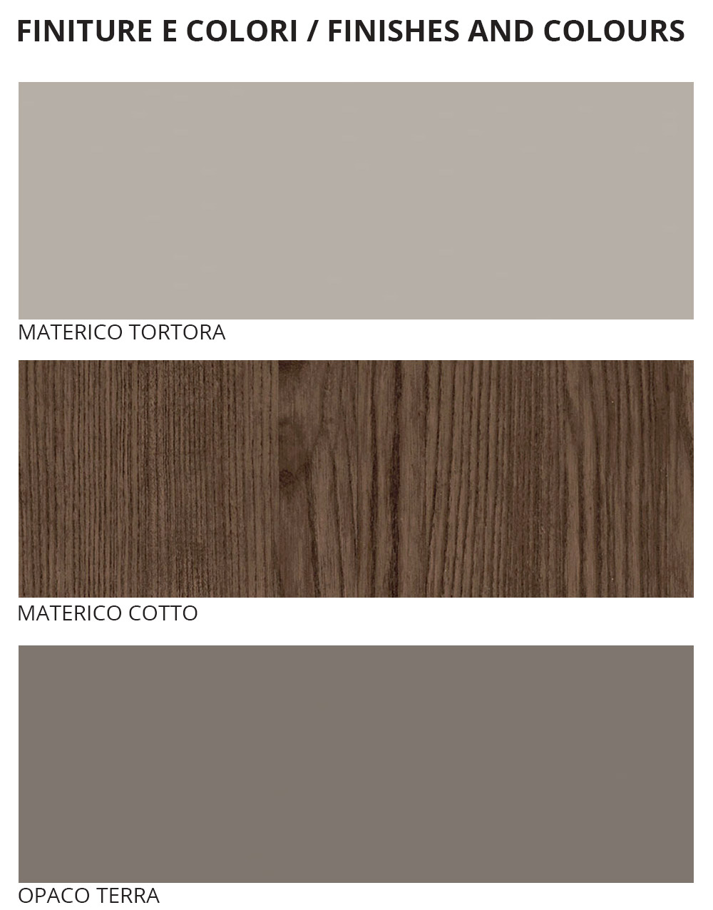 double bed with bed frame and headboard in dove-grey textured wood, a 2-drawer bedside table, 2 single bedside tables (1 drawer) and a 5-drawer high chest of drawers (made up of 5 modular elements) in terracotta, textured wood dove grey and terra matt lacquer. Furniture with an idea apparently based on simplicity but which hides a
