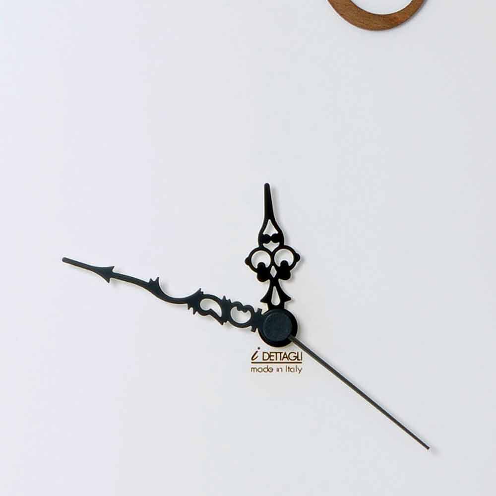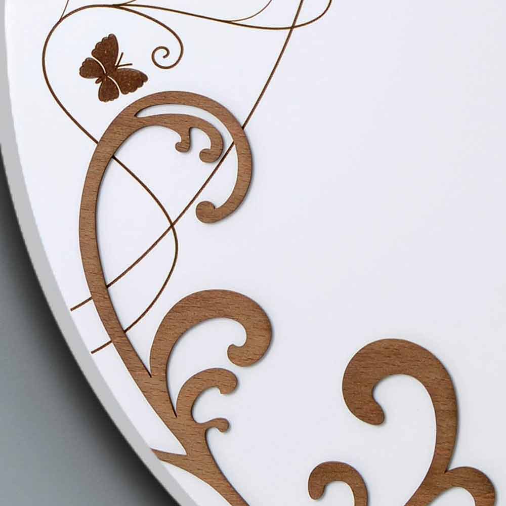Modern design round wall clock, in decorated wood, made in Italy.