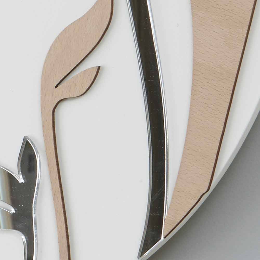 Wall clock with a round design in white wood with wood and plexiglass decorations, modern and made in Italy.