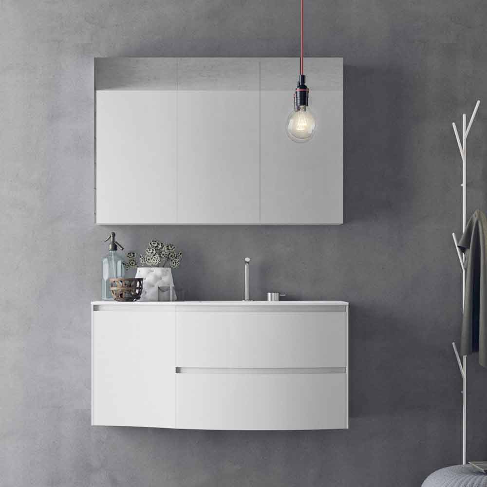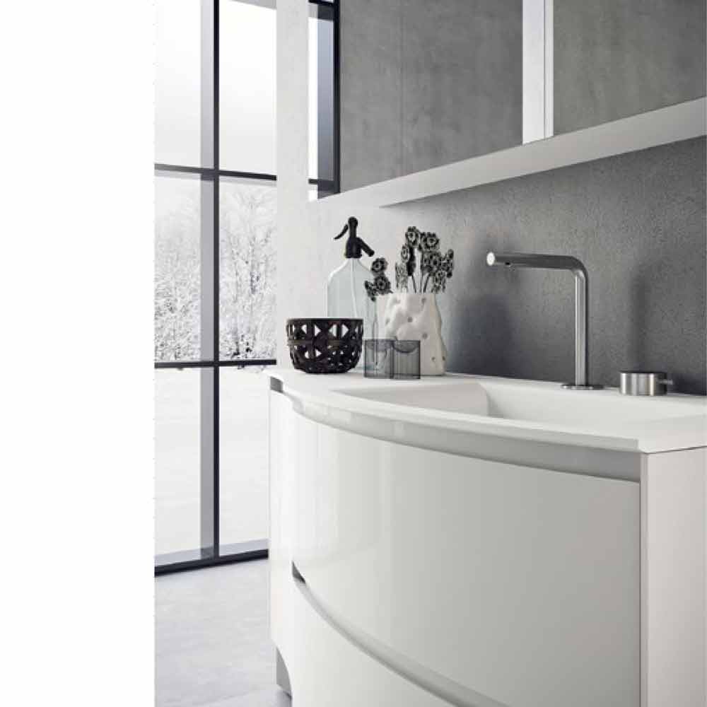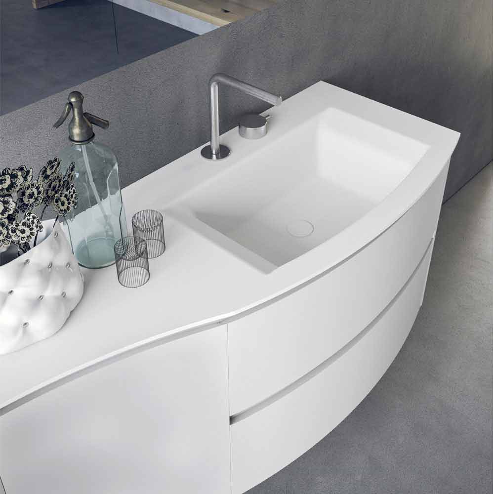 Minimal bathroom composition, suspended and curved design with integrated sink, made in Italy.