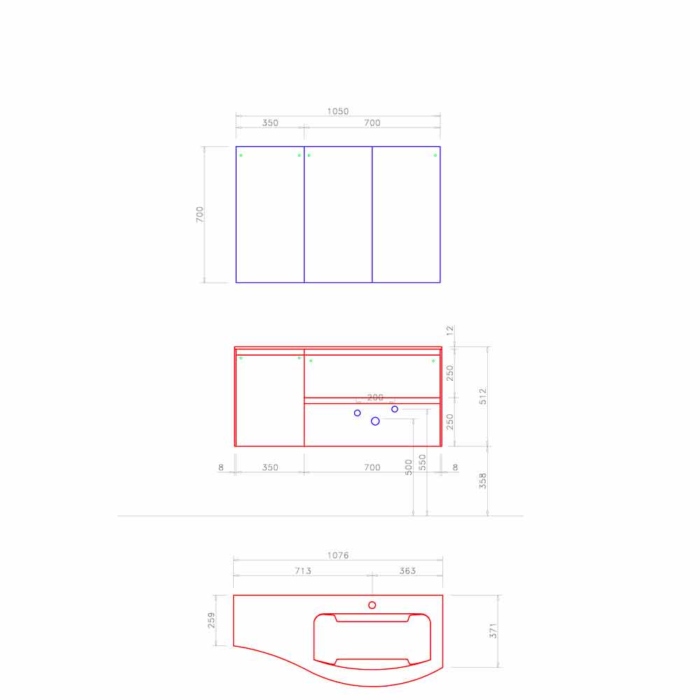 The peculiarity of this composition is given by the silhouette of the built-in washbasin characterized by two lateral sides that gently descend towardss the basin.
