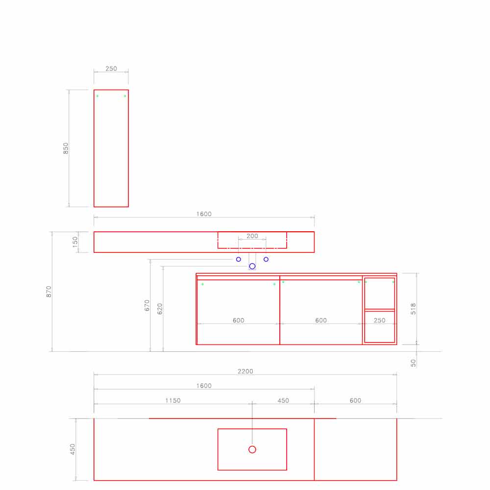 - box top with integrated washbasin in Teknorit h.15 without overflow hole, tap hole included, including free waste drain L.160 X D.45 X H.12 cm
