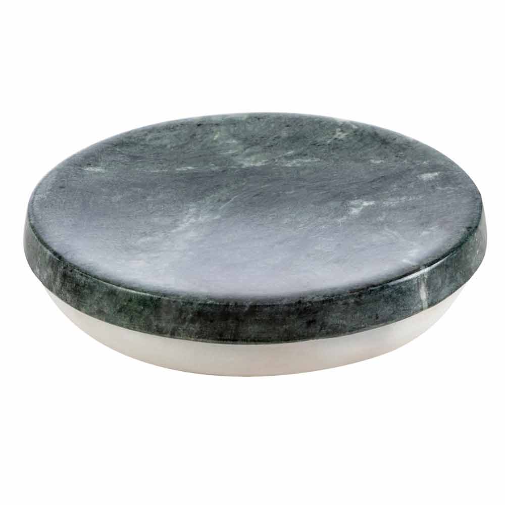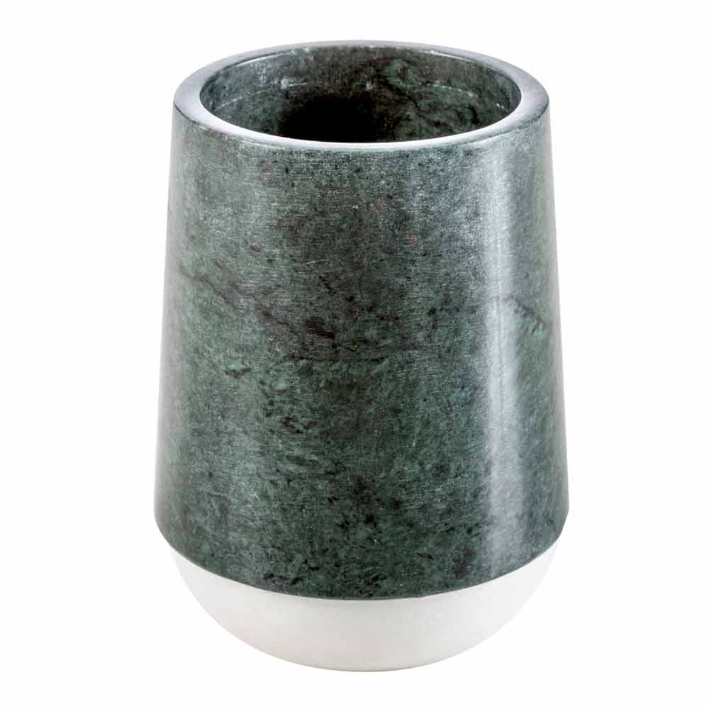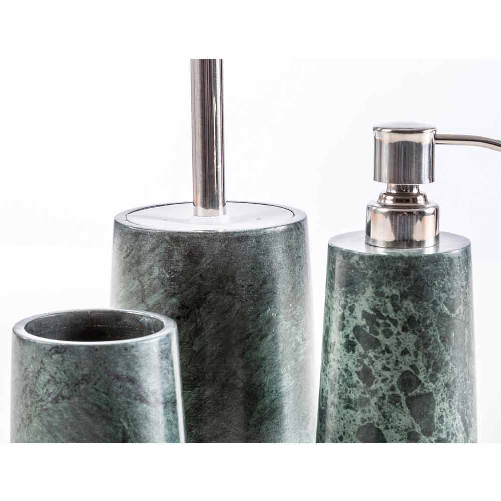 Bombei is the bathroom accessories set made of mottled green marble rich in veins that rests on a Calacatta marble base.