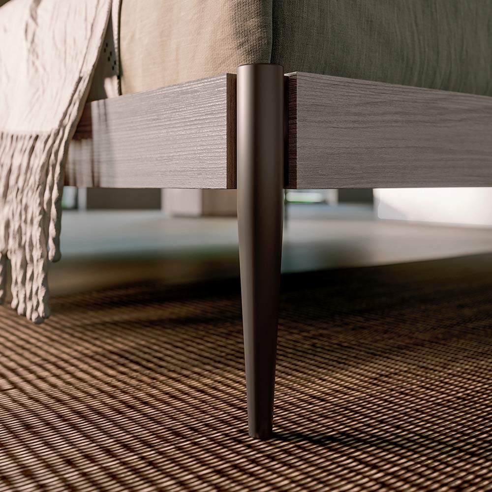 burnished metal , 2 bedside tables with 2 drawers each and a high chest of 6 drawers in wood with oxidized material finish and matt feather lacquer. The bed becomes the protagonist of the furniture thanks to its grandeur and its design that reworks in a contemporary key a reference to