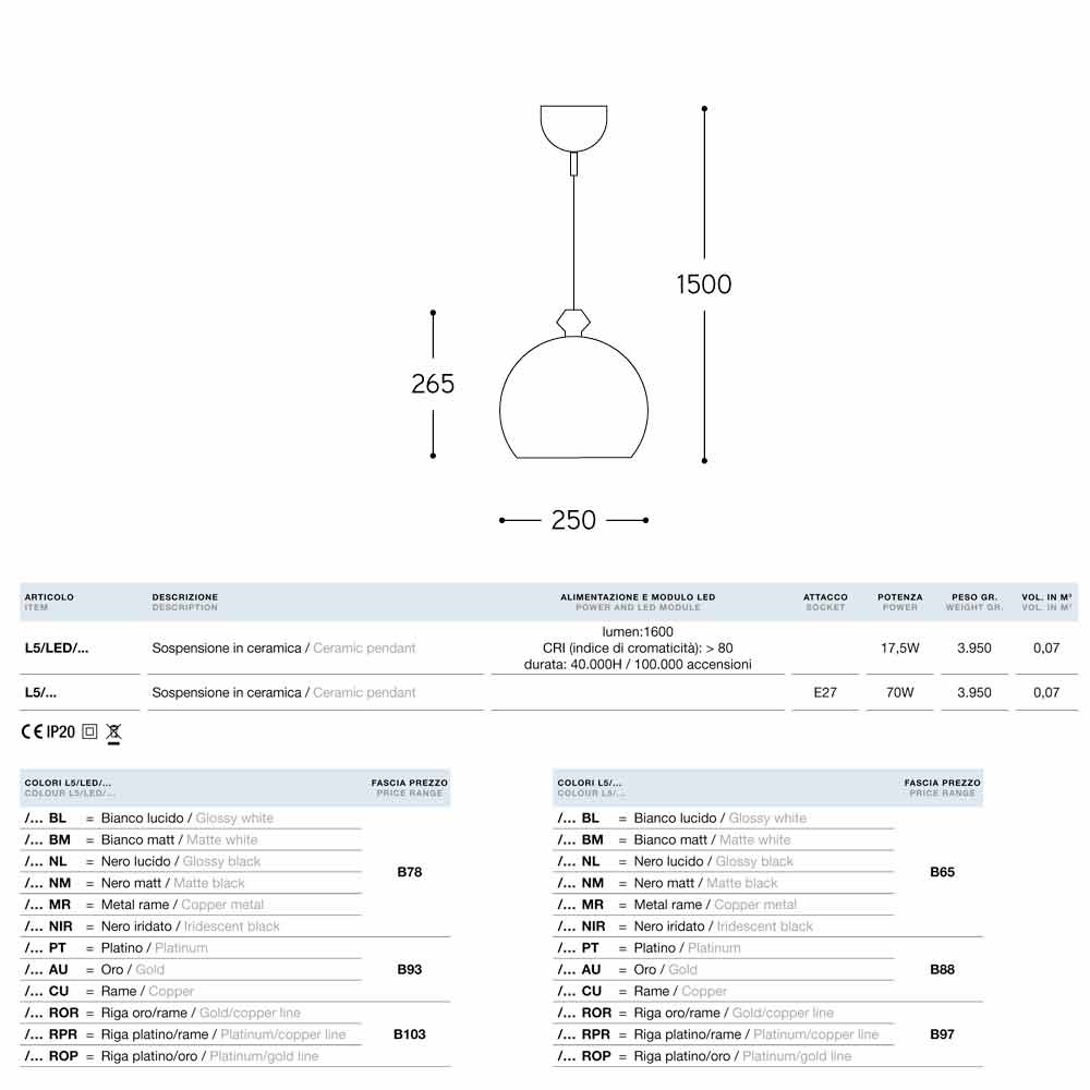 Modern ceramic pendant light I Lustri 5 -1 output canopy, made in Italy
