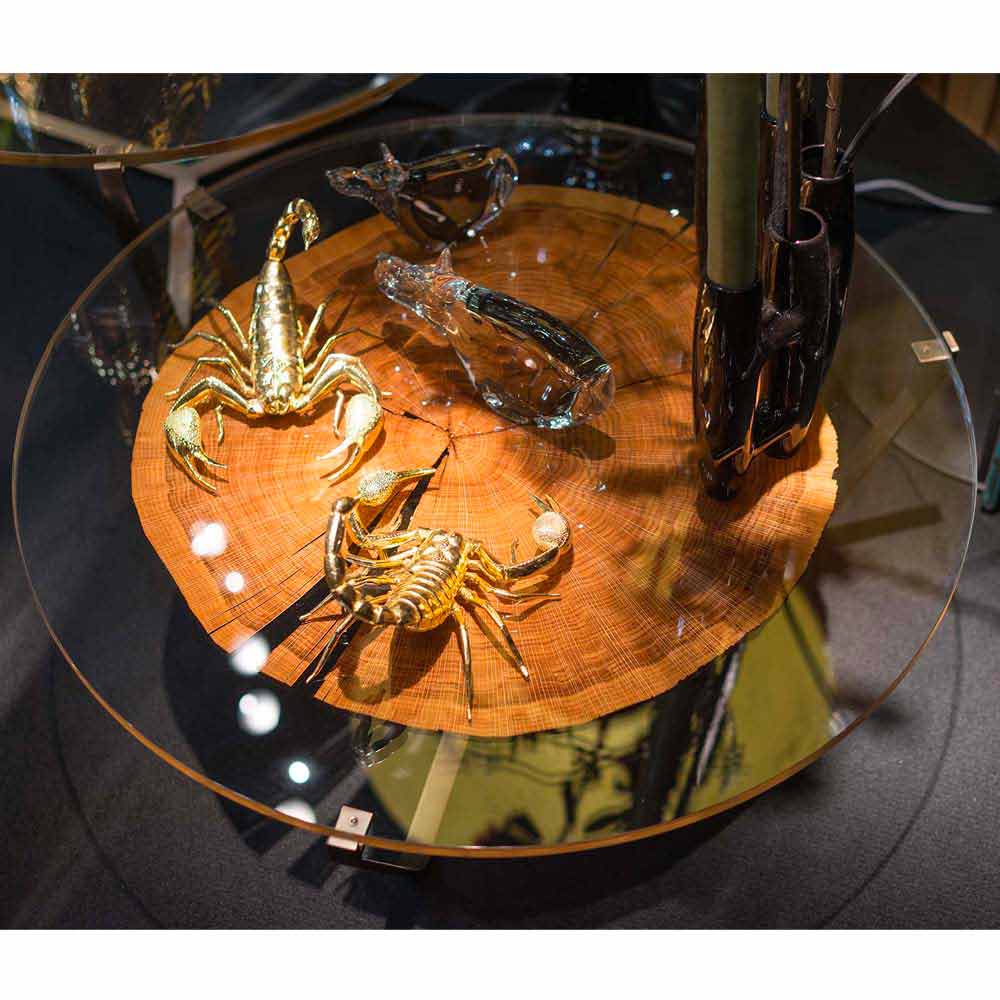 The top is composed of two layers (5 cm + 5 cm) of coupled glass, containing a section of head-cut wood.