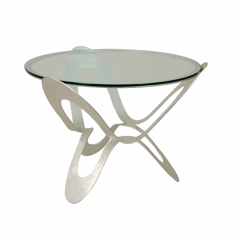 Low round coffee table produced in Italy handcrafted in glass and gold or silver leaf iron.