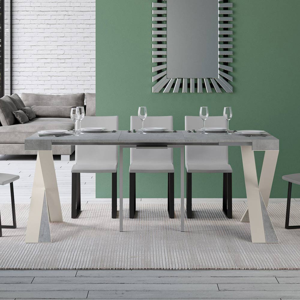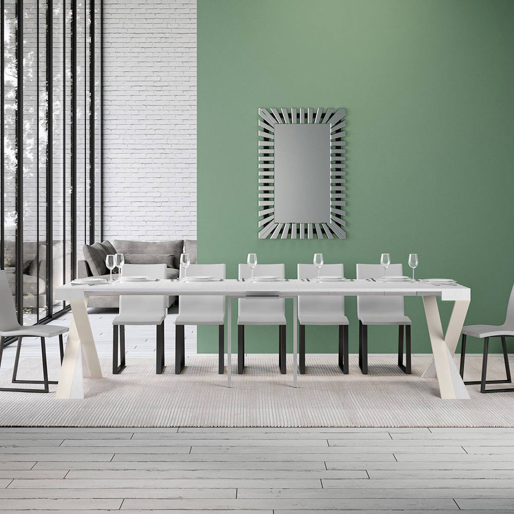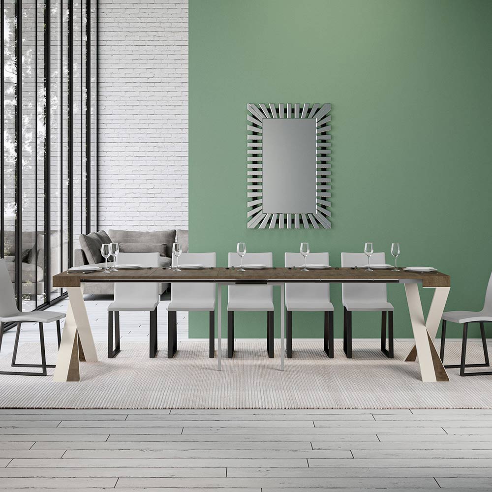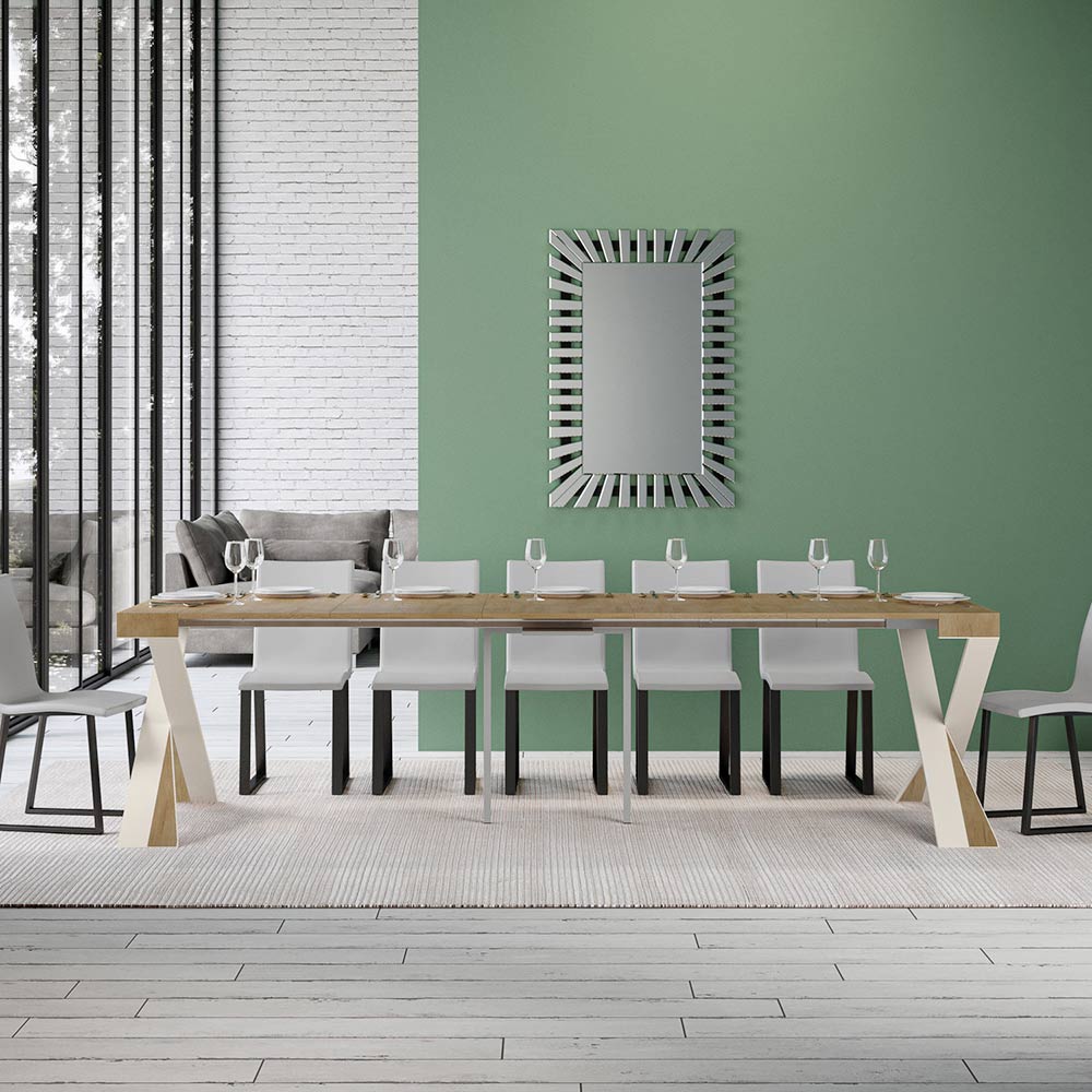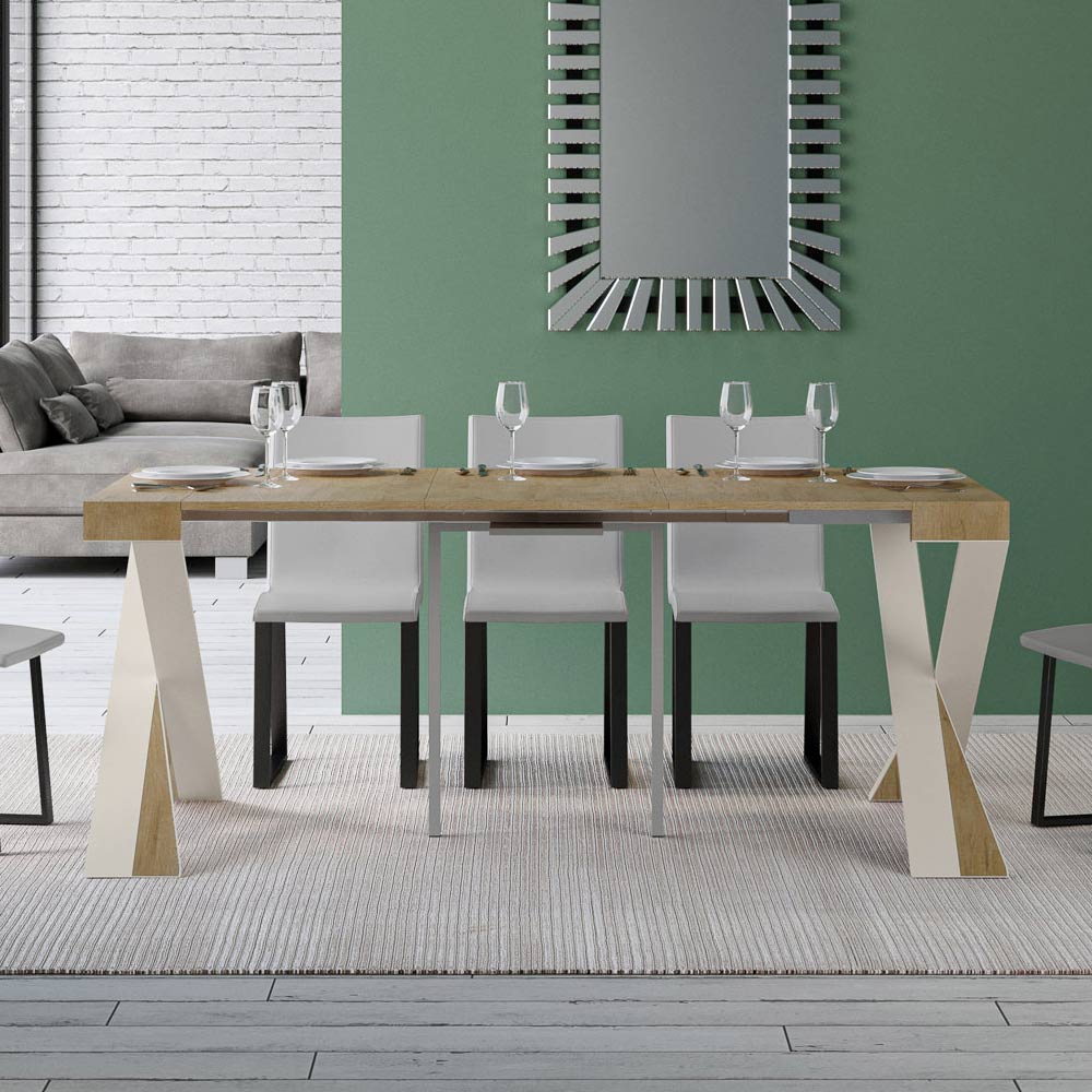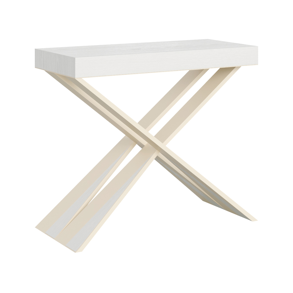 This extendable console table embodies elegance and functionality in an eye-catching design. É features a modern silhouette with a X base that not only provides solid support but also adds a touch of sophisticated originality. The top in furnished woodè a tribute to the quality of Made in Italy, prized for its durability and ability to withstand the passage of time.