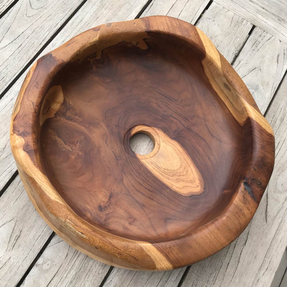 Natural and polished teak in an essential and practical shape. Untreated wood returns the scents and colours of tropical forests. Countertop washbasin in smooth and untreated natural teak.