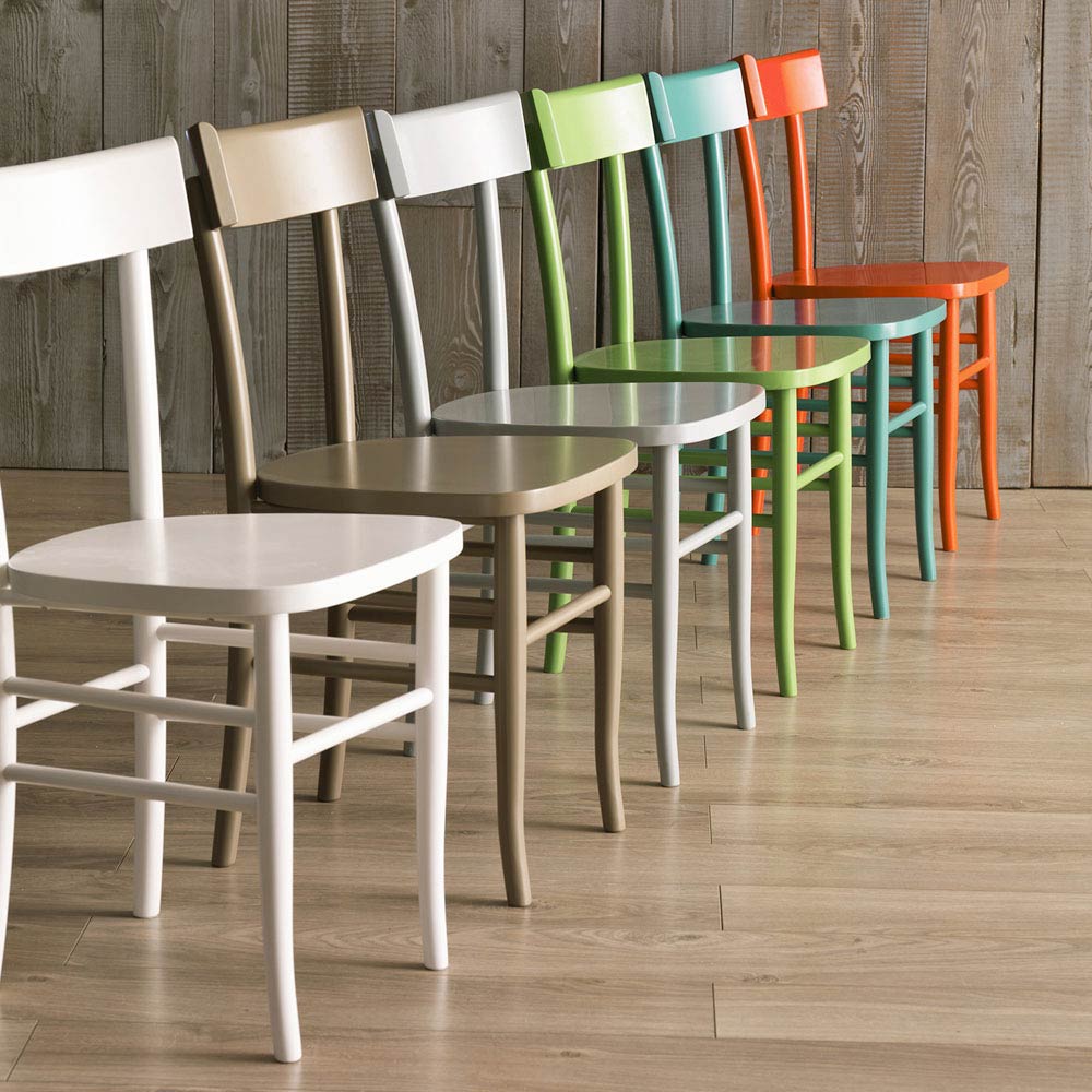 Chair in lacquered beech wood, available in different colour variations. Select the finish you want from the drop-down menu.
