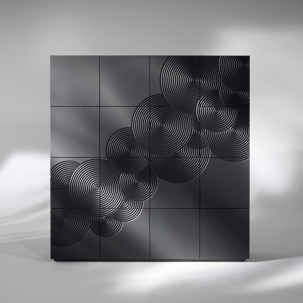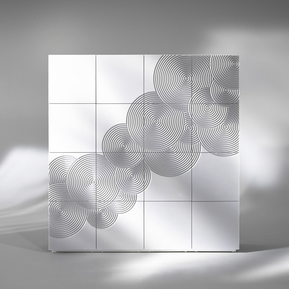 Sideboard with 8 decorated doors with 4 internal shelves in lacquered MDF, made in Italy.
