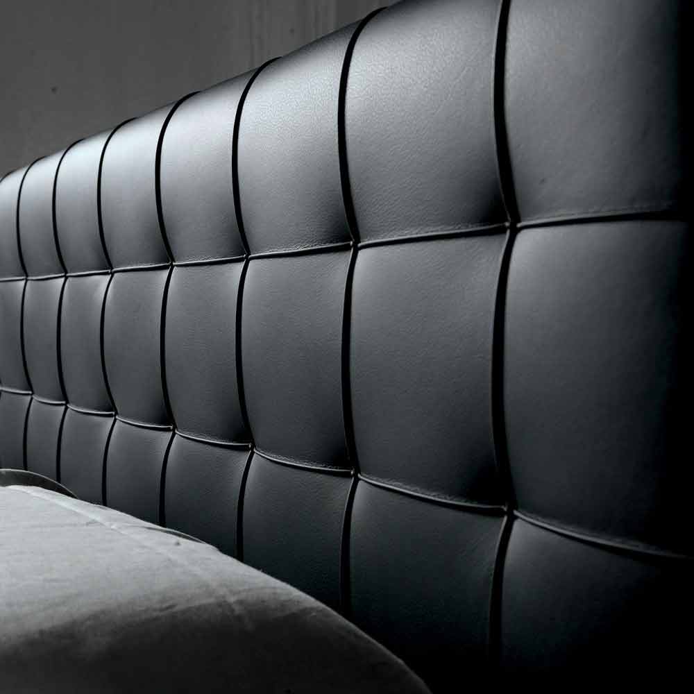 The capitonnè headboard, upholstered in top quality full-grain leather, enhances the solid walnut structure of the bed, for an elegant and evocative aesthetic result.