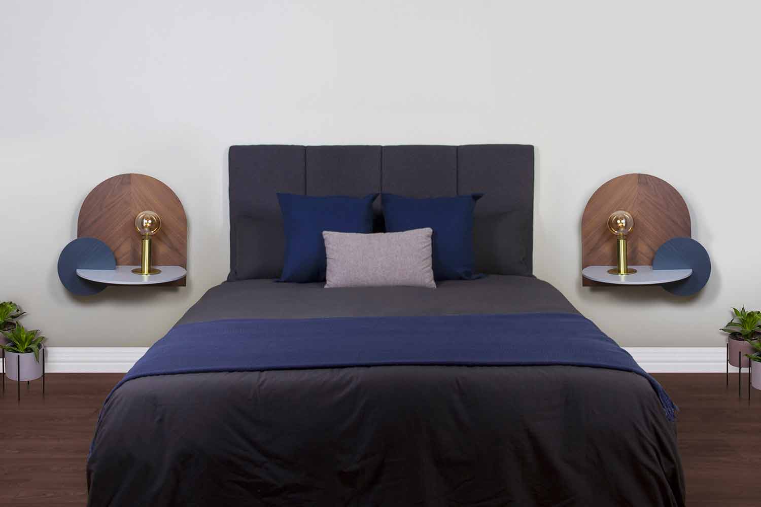 This modular bedside table represents an innovative and original idea able to conquer every attention inside the room thanks to its unique style and the combination of materials and finishes that give elegance and an extremely modern design . Its structure is made up of 3 plywood panels, one in walnut wood finish and two in blue and grey painted ash finish . The panel that acts as a real support surface is fixed to the wall and the 2 modular panels are mounted on it, which can be positioned in 8 different configurations, thus obtaining a product that can be customized according to one's needs and spaces. The structure also has a cable hole positioned behind the front panel, allowing them to be hidden and making the bedside table even more functional and practical. Between the vertical panels and the wall there is a 9 cm compartment that can be used to store and organise books and magazines or any other object, optimizing the available space to the best.