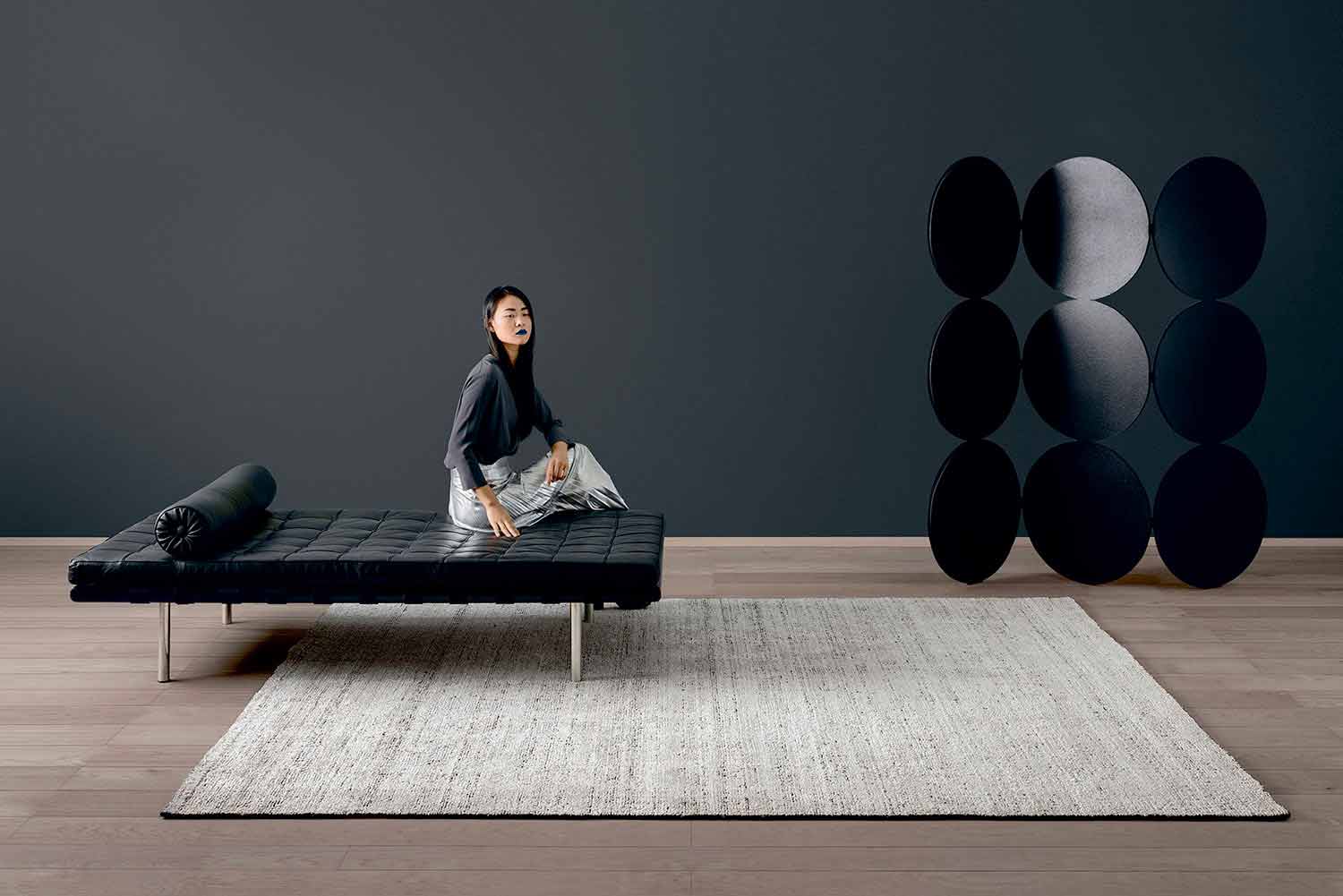 This queue of hand-knotted carpets originates from the union of hand-carded bamboo silk, wool and cotton.