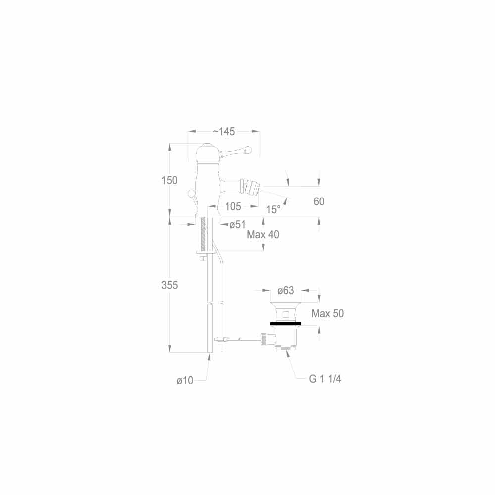 Classic design countertop bidet mixer in chrome finish brass 150 mm high and 105 mm centre distance, with drain and pull-rod.