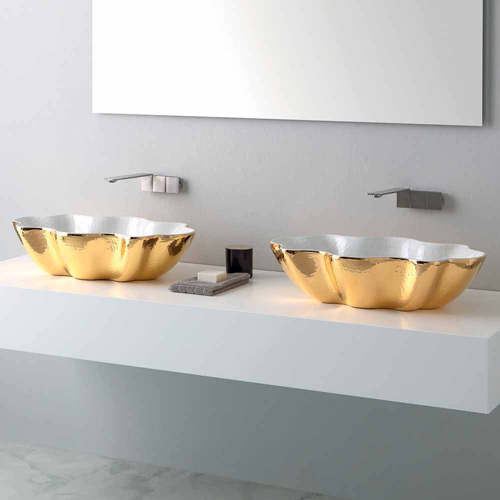 Cubo is a countertop washbasin made in Italy in extraluxury ceramic in two colours of gold and white.