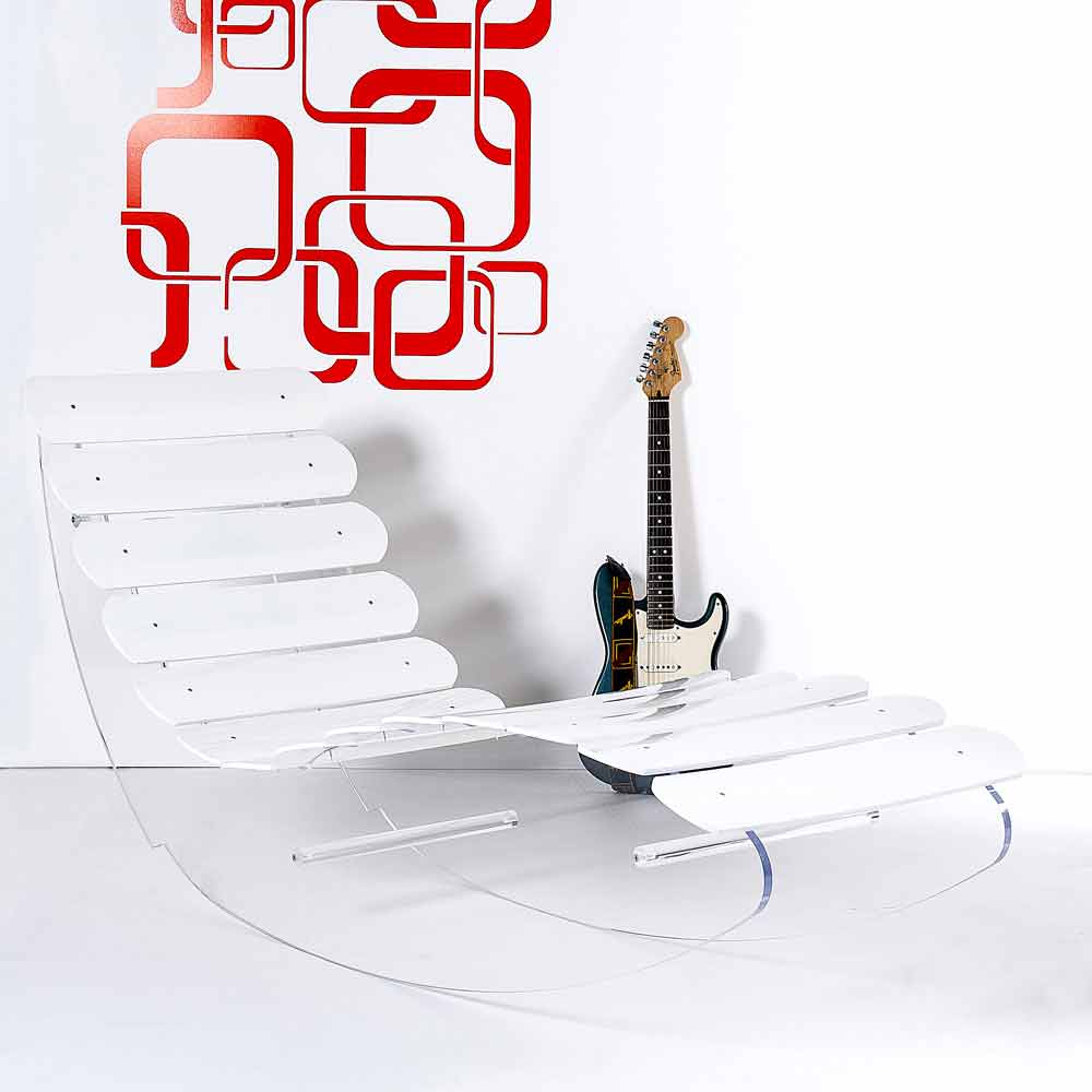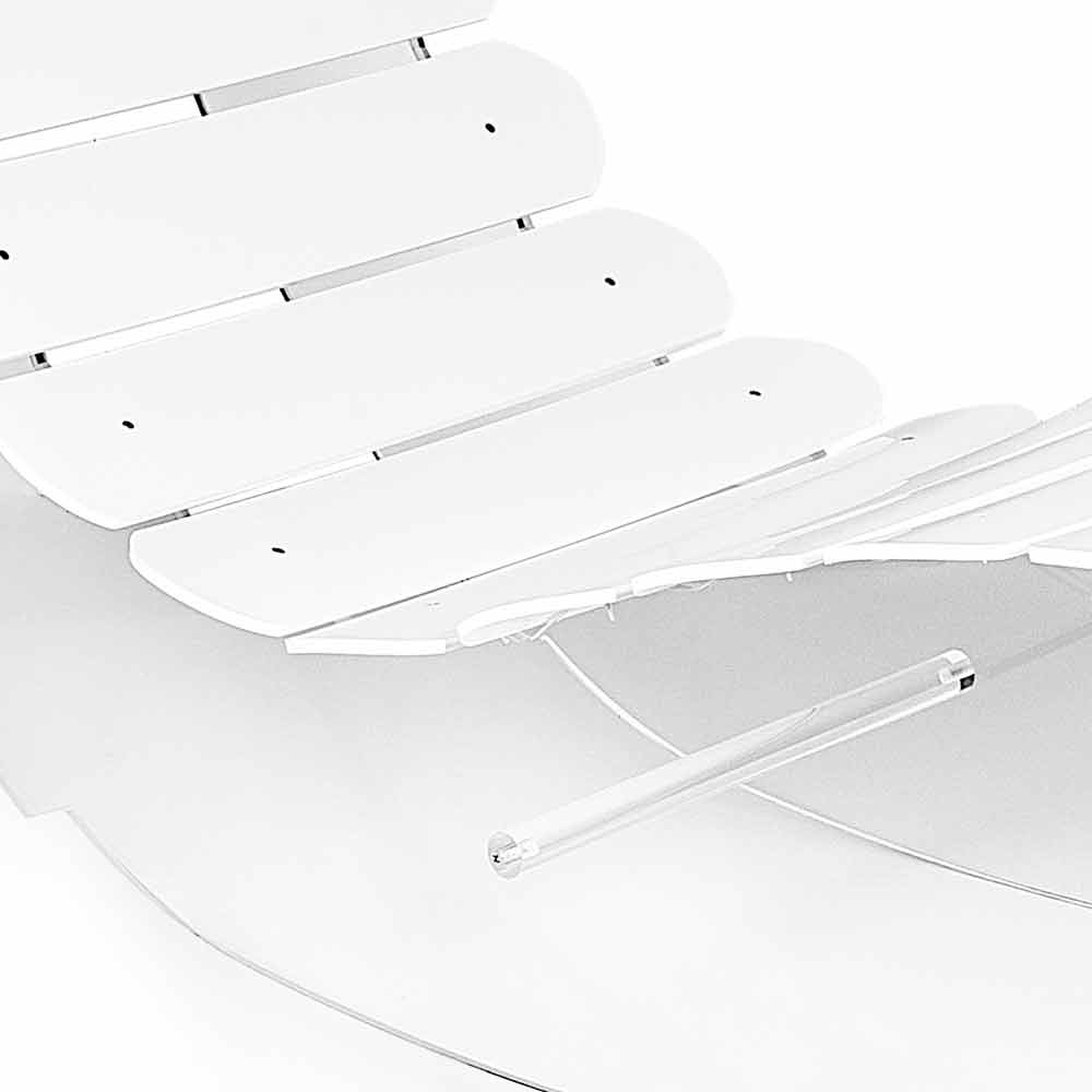 Sinous chaise longue made in 100% PMMA clear transparent plexiglass, reminiscent of the wings of a gull turning over the sea. The shiny white slats are made in 100% PMMA plexiglass from virgin polymers.