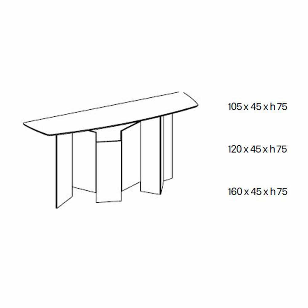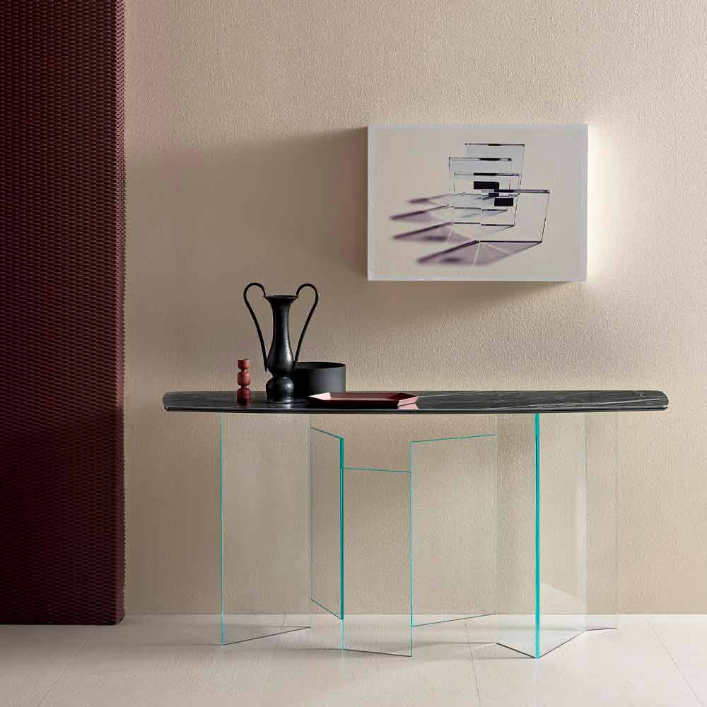 Modern livingroom consolle with Emperador or Noir Desir ceramic top and glass base, realized by hand in Italy.