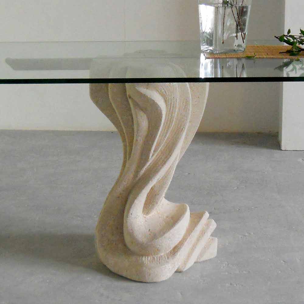 The dining table Agave is entirely made in Italy. Its base is made of Vicenza natural stone and it has been hand-carved from the original stone block. The table top is made of float crystal (15 mm thickness) which is supported by a painted brushed metal bar.