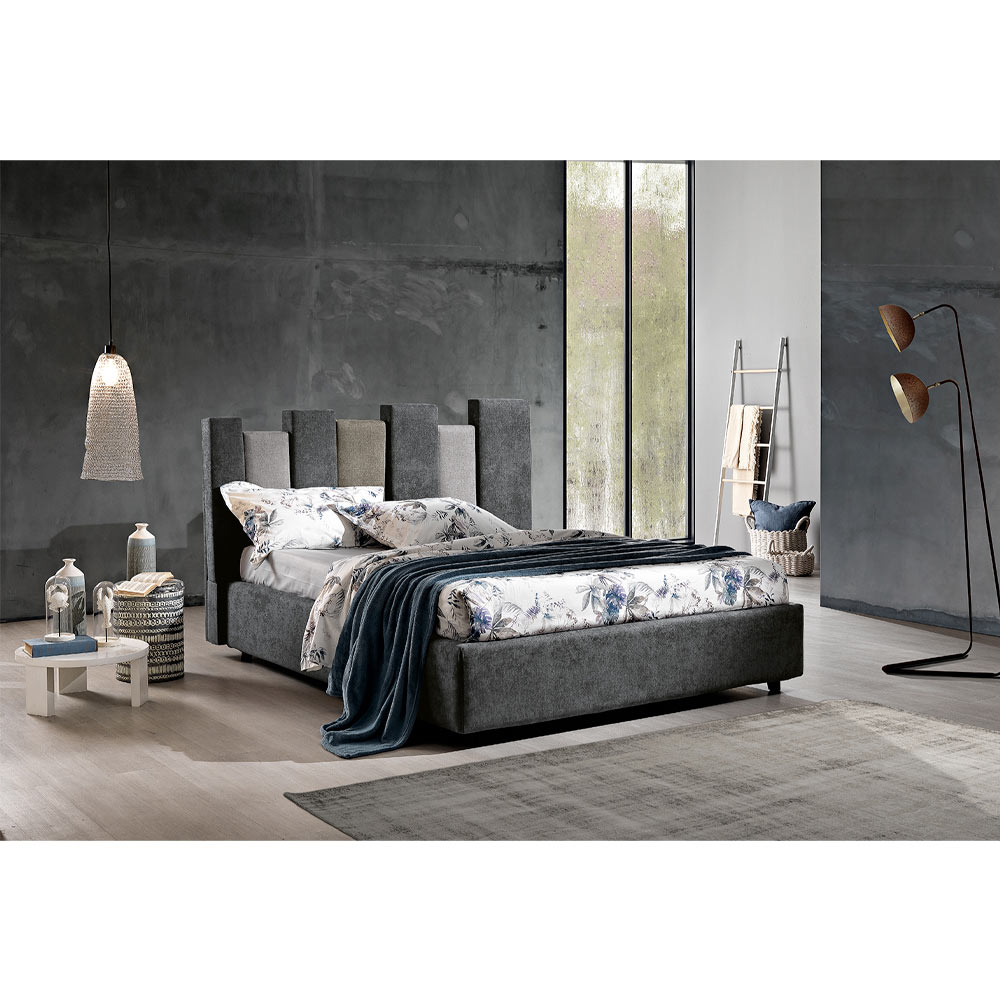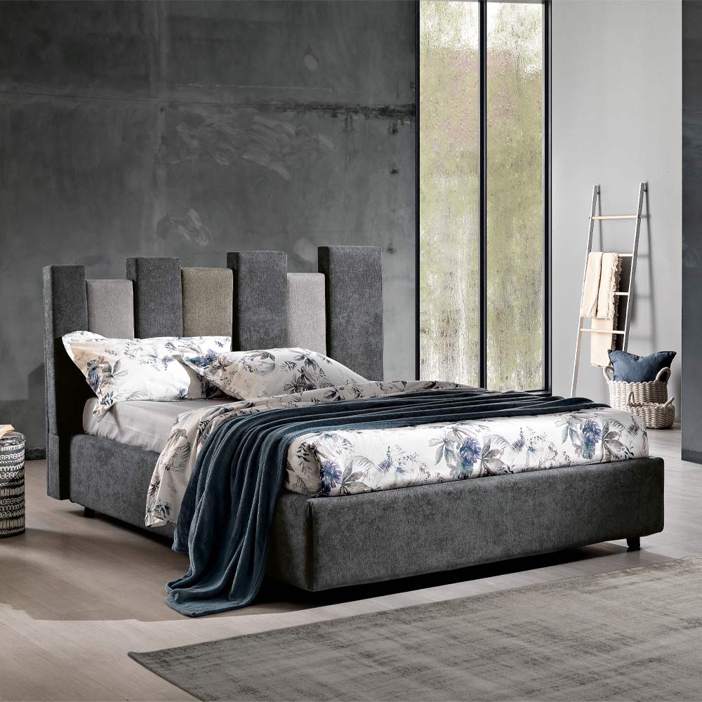 Modern double bed upholstered and covered in fabric, made in Italy.