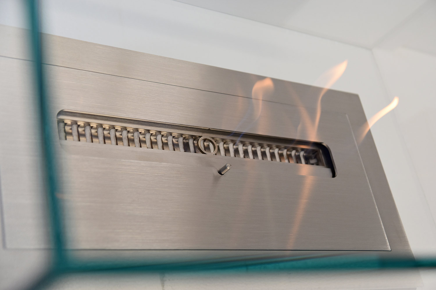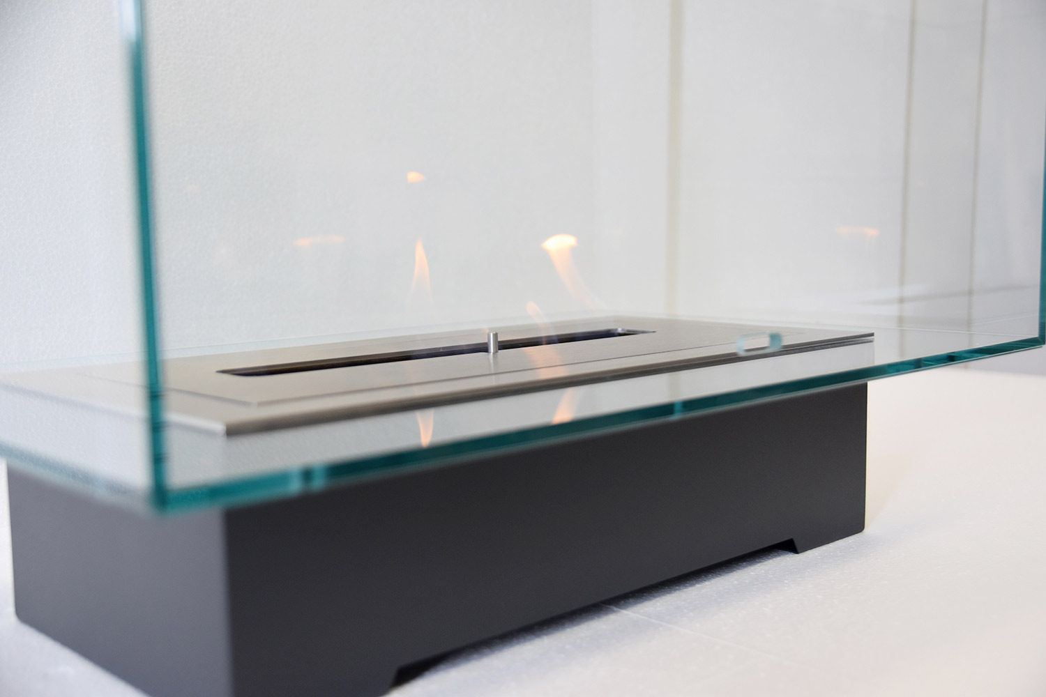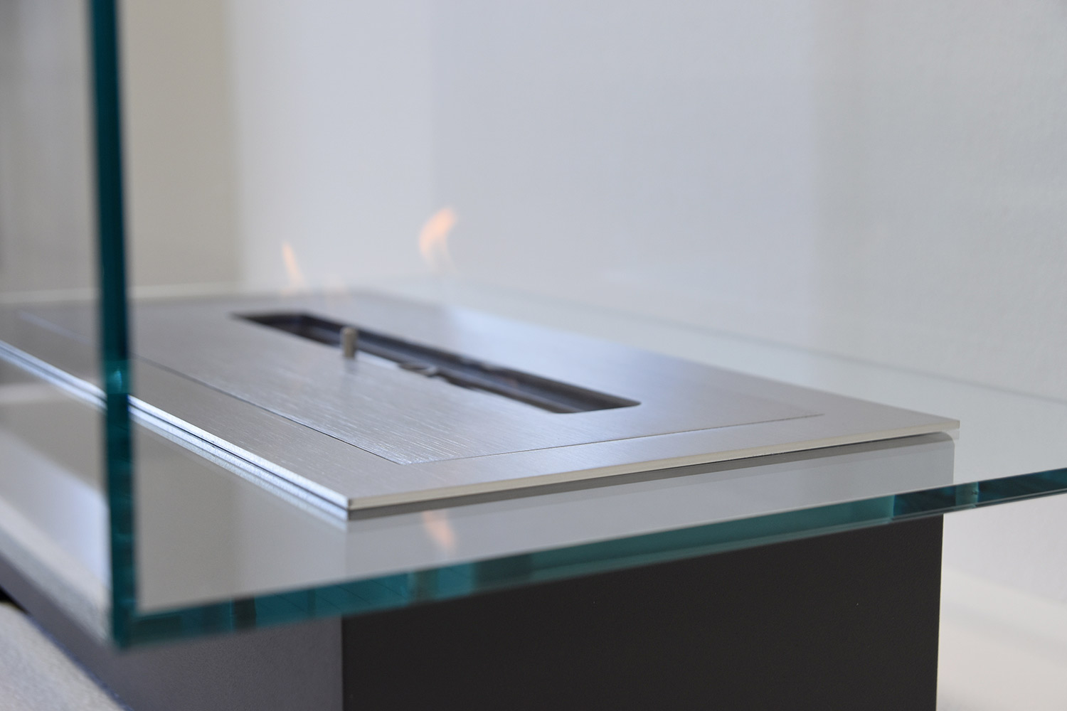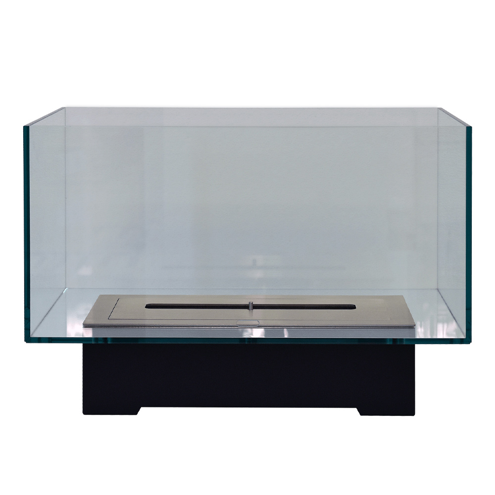 transparent rectangular glass space that contains the flame, creating a sort of continuity with the surrounding environment and becoming the protagonist thanks to the small