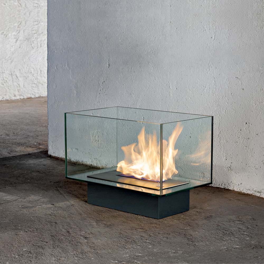 Elegant and seductive, this indoor bio-fireplace is an intriguing game of volumes and transparencies that can be placed in the