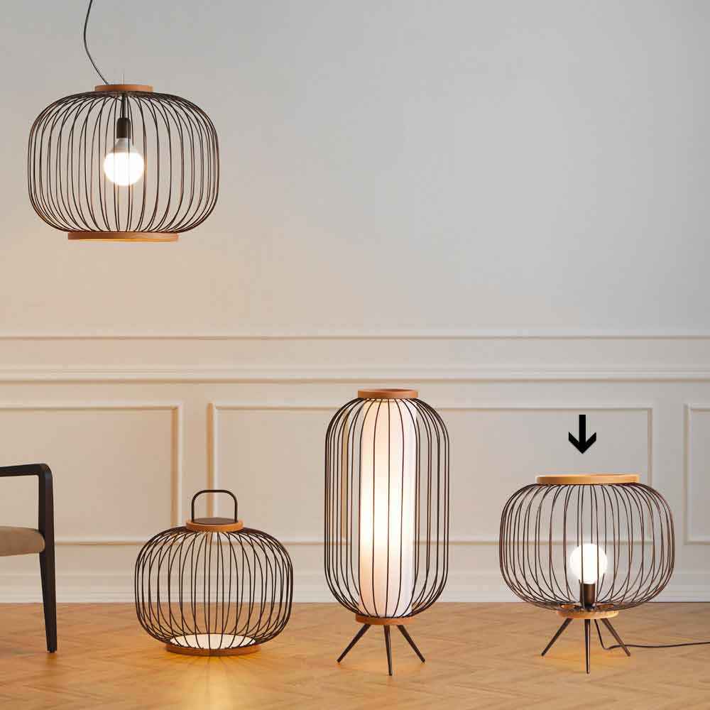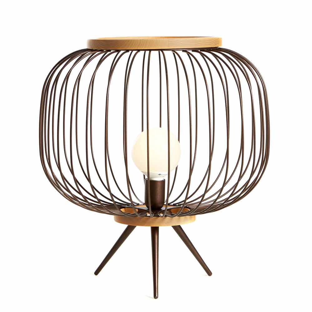 Floor lamp made of shaped steel bar and painted with epoxy powders. The two bands that close the rounded body are made of natural wood. The floor versions can also be used as empty pockets both in the lampshade version and without. The LED source of the version with handle is equipped with a rechargeable battery with an autonomy of about 6 hours.