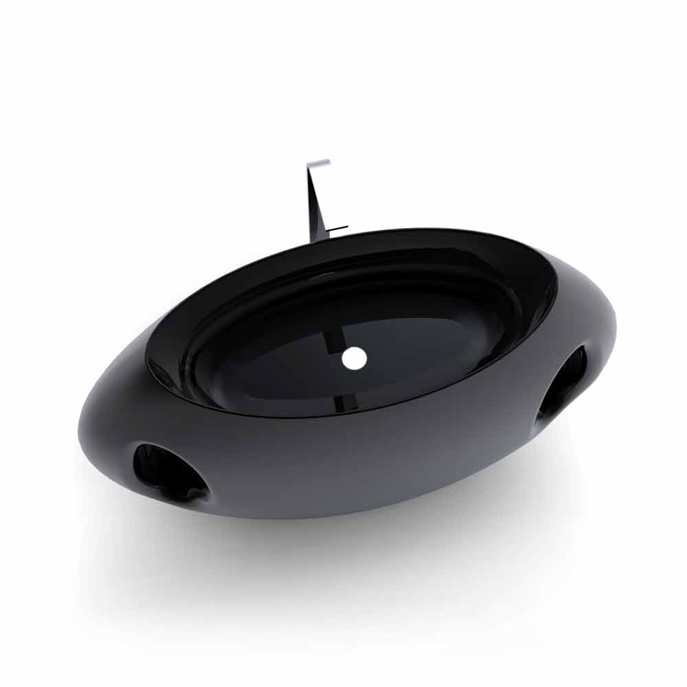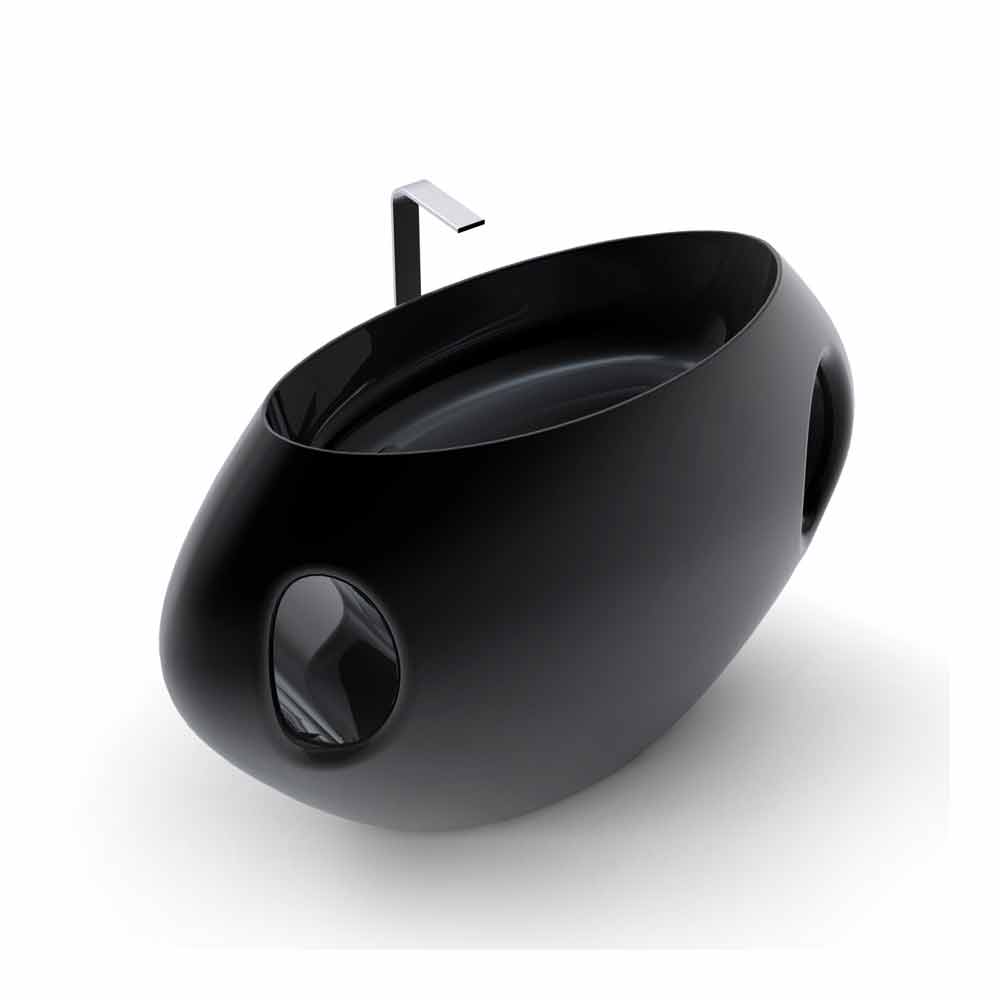 Solid Surface scenographic washbasin; free-standing, with shapes inspired by large classic vases. It is characterized by elliptical geometry queues, wide and stretched, which mark the complement. Its generous shapes and the two ellipses in the shape of "handles" show a profile that brings to mind the shape of a large vase. Its name "Pandora", in fact, refers to the most famous of the ancient vessels belonging to the world of Greek mythology, the mythical Pandora's box. Its characteristics, in addition to the vasiform profile "stretched" in width, also a comfortable and wide basin with a horizontal cut and two elliptical decorative slots on the fronts, which cross it from side to side, also serving as a towel holder. The sanitary fixture has good ergonomics, as it is abundantly rounded, available in two colour variants: White (RAL9003) or Black (RAL9005)