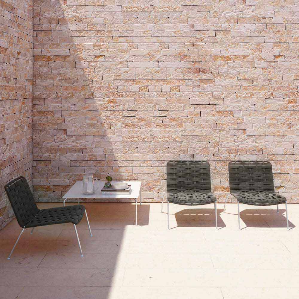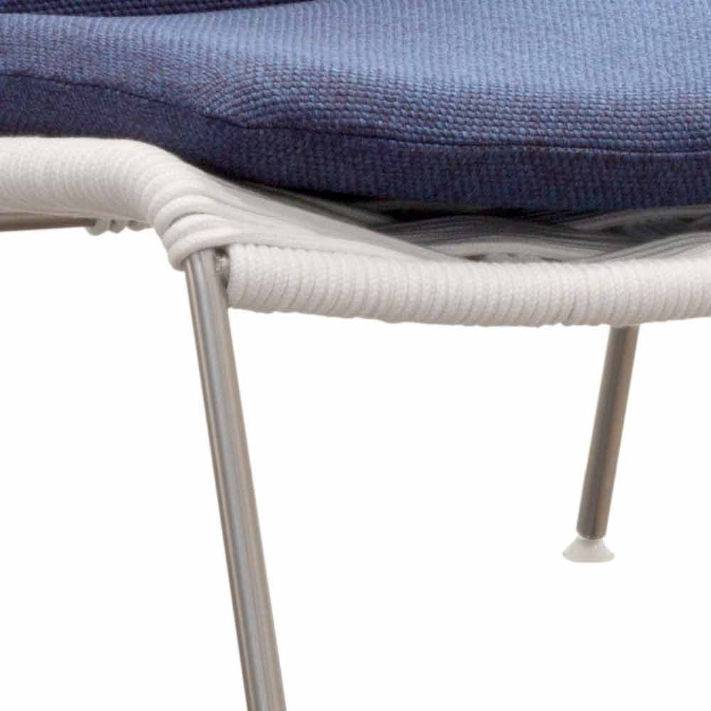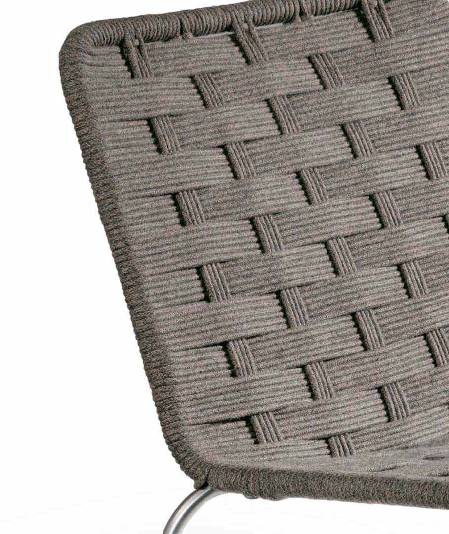 It is a small armchair with a satin stainless steel structure. Seat and backrest woven in acrylic cord with the possibility of choosing between colours: