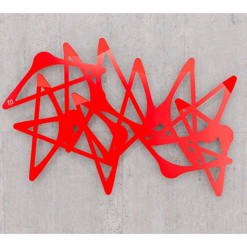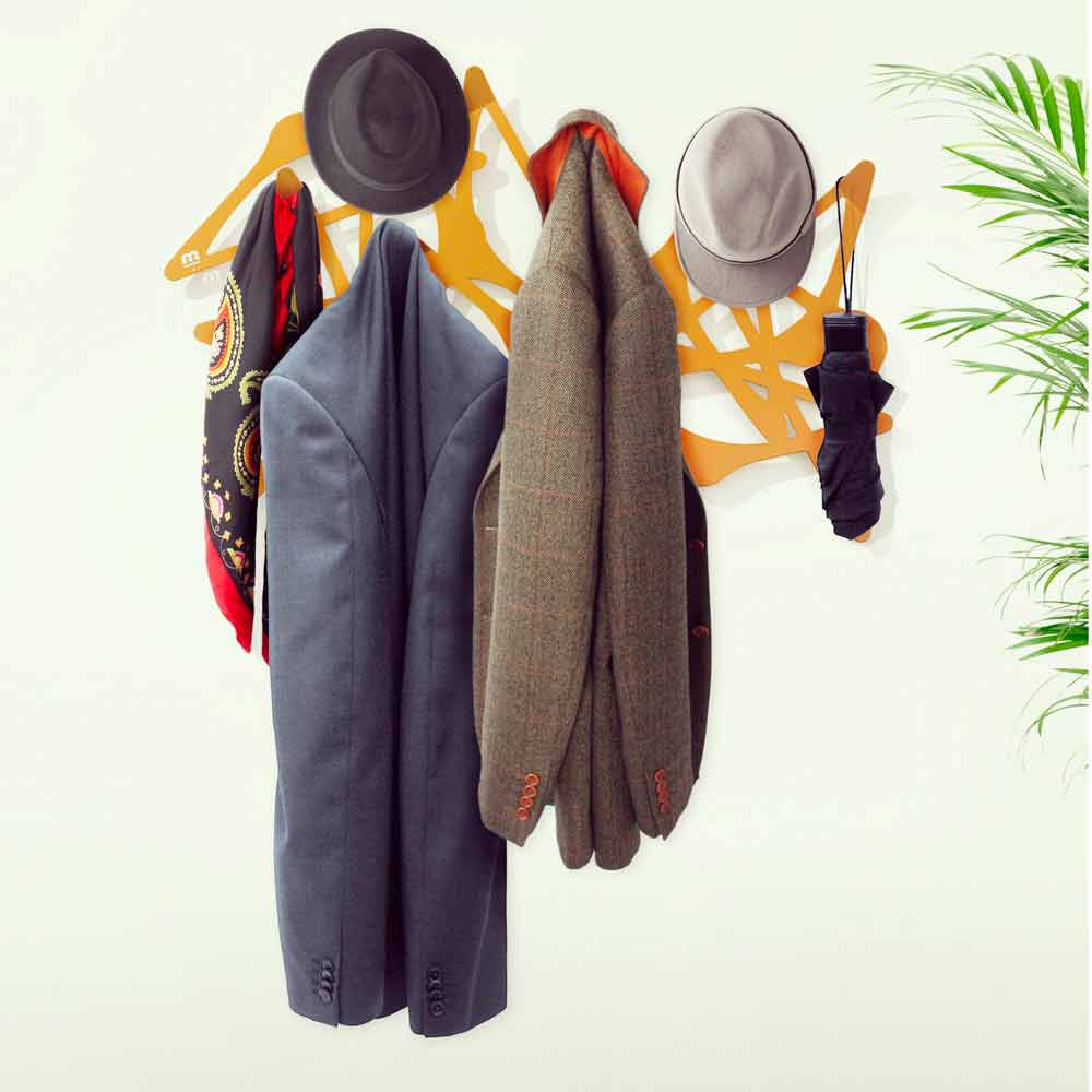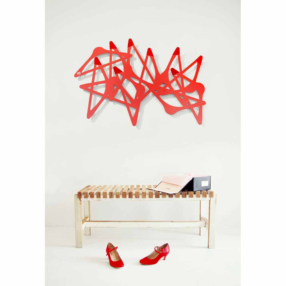 Mess to clean up. If not between words, at least among jackets and coats. Blabla is a funny coat hanger made of  laser-cut metal, shaped like a chaotic and messy stylised hanger. It is available in the colours white, red, black, orange and green.