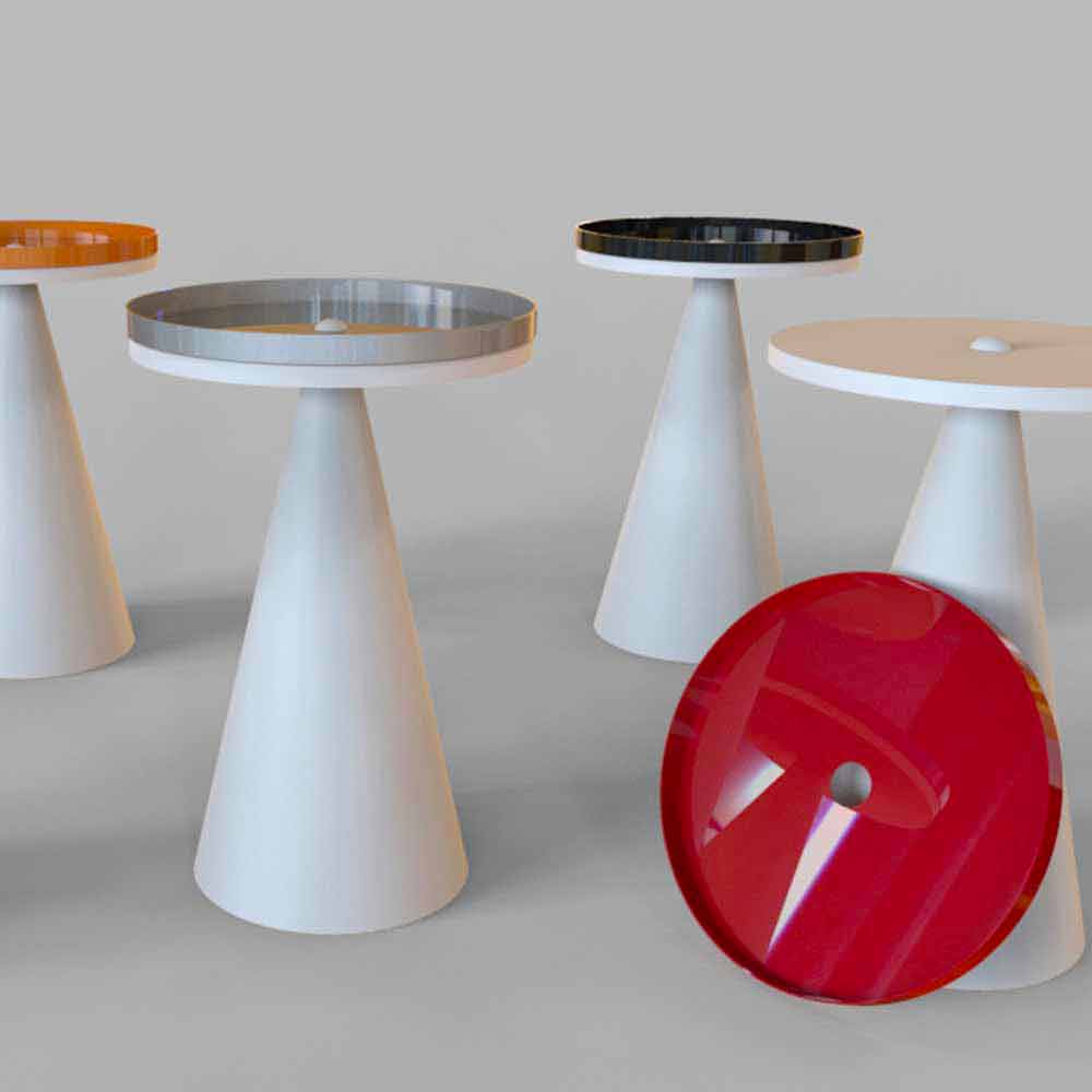 The base, made of matt white afamatx, contrasts with the upper top in glossy painted sheet metal. The latter can be used separately, increasing the usability of the tray and at the same time guaranteeing a double support surface.