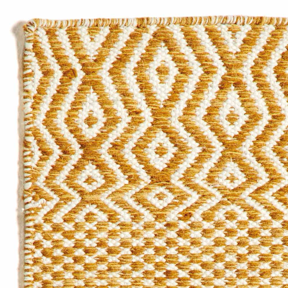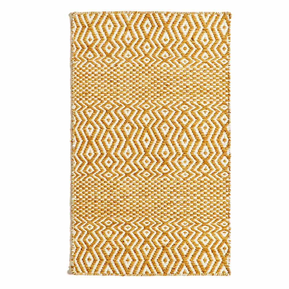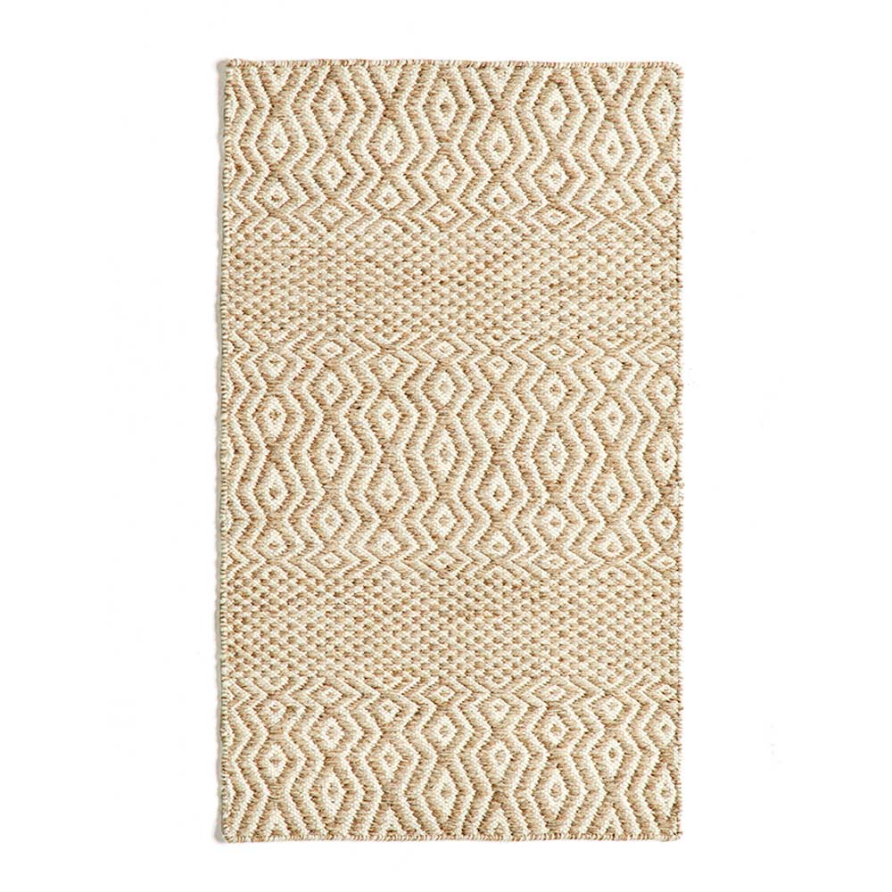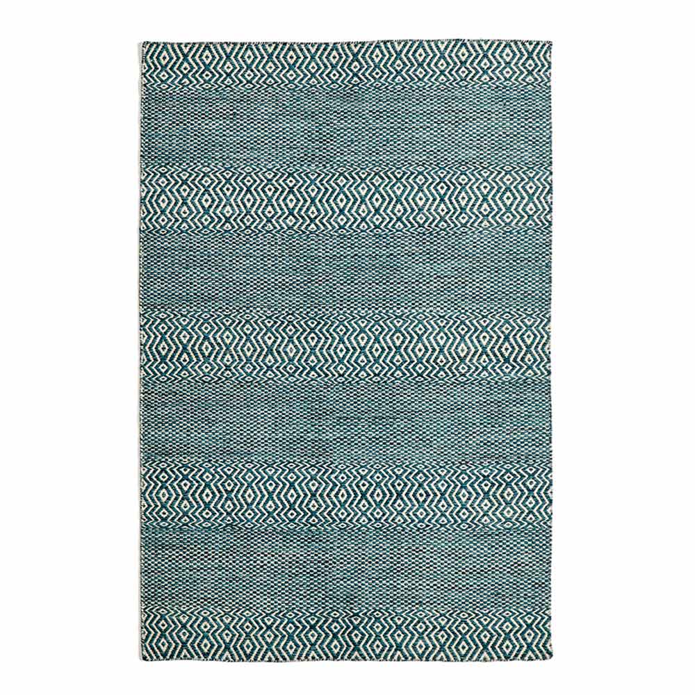 Hand-woven lounge rug in wool and cotton with patterned design.