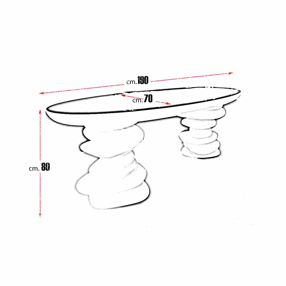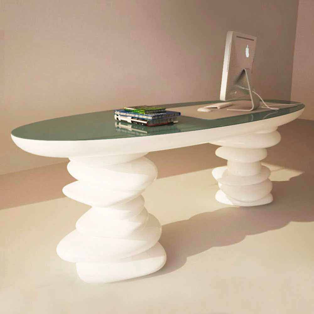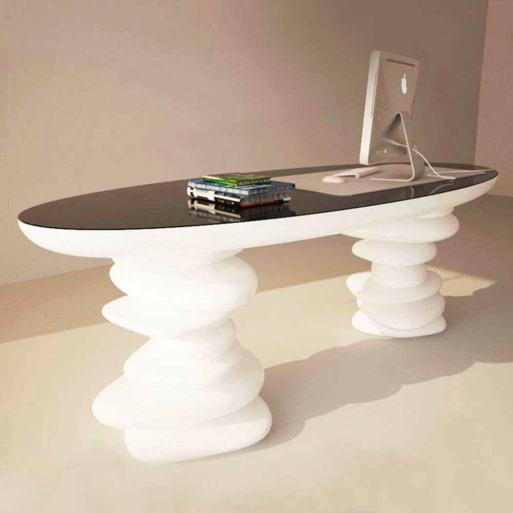 The Aldington desk can be used not only as an office meeting table, but also as a dining table or reception desk. The two legs that support it have the shape of overlapping petras. Glossy lacquered finish.