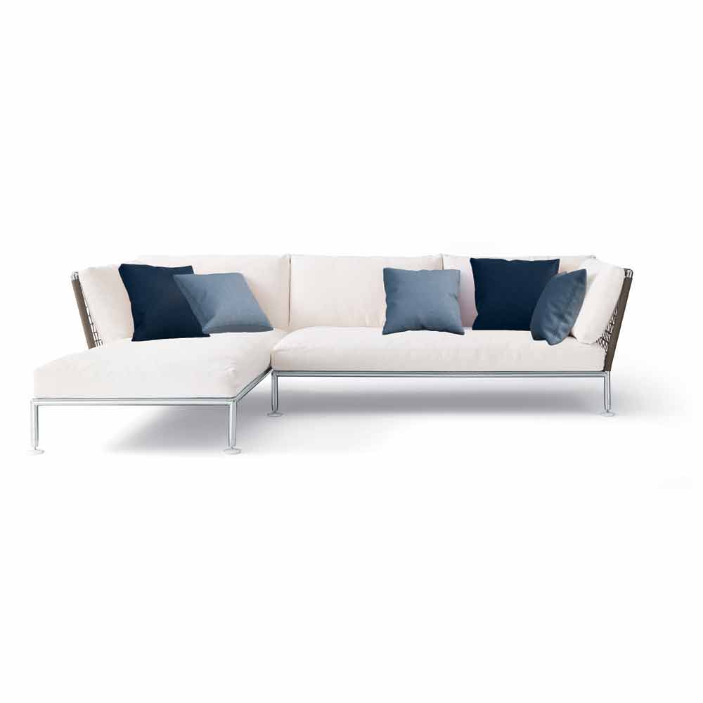 It can be placed in a corner of the terrace, in the garden or in all spaces where you can recreate moments of serenity and relaxation without sacrificing the unmistakable style of made in Italy, the corner sofa with chaise longue has a satin